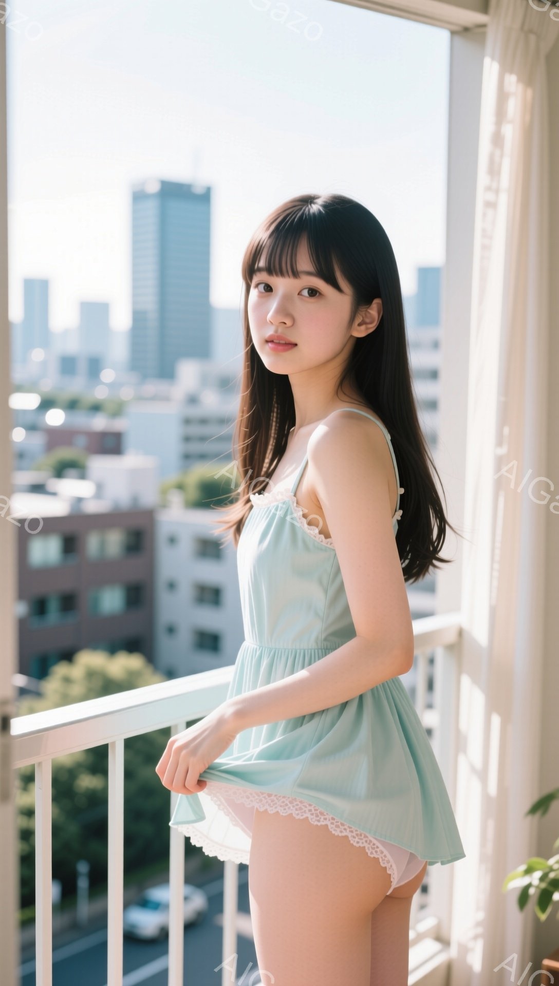 長い黒髪で前髪が目に少しかかる女性が、水色のキャミソールワンピースを着てバルコニーに立っています。彼女はスカートの裾を少し持ち上げており、表情は穏やかで微笑んでいます。背景には高層ビル群が広がり、晴れた空と白い雲が広がっており、爽やかな雰囲気が漂っています。