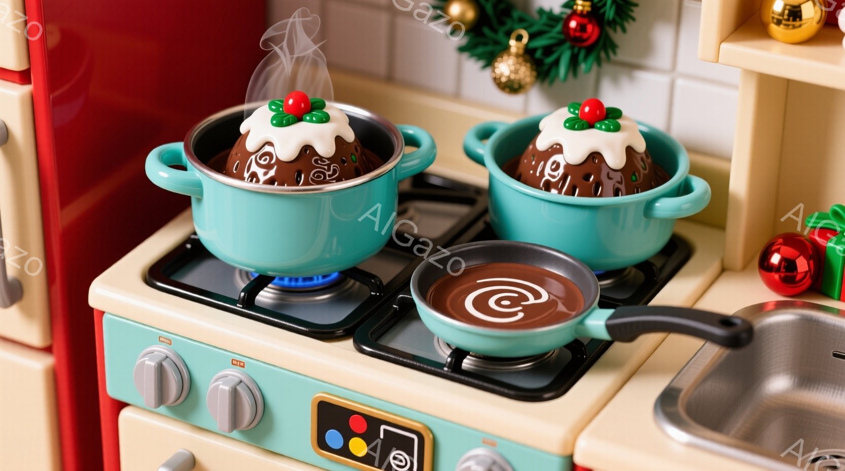 おもちゃのキッチンレンジの上に、クリスマスのプディングが煮込まれている様子が描かれています。銅色の鍋とフライパンには、クリスマスプディングとソースがそれぞれ入っており、まるで本物の料理のようです。背景には、クリスマスケーキや飾りがわずかに見え、おもちゃのキッチン全体が温かく楽しいクリスマスの雰囲気を醸し出しています。