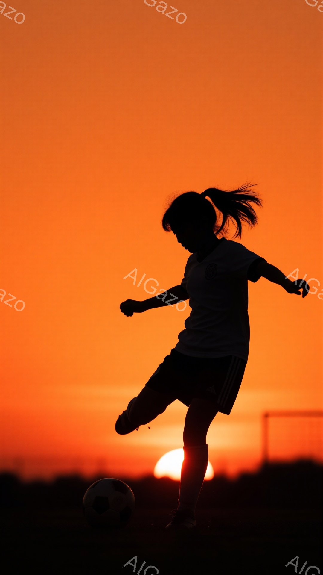 「少女が夕焼けを背景にサッカーボールを蹴るシルエットが印象的だ。彼女はポニーテールで、スポーツウェア姿で、片足を高く上げてボールを蹴る動作をしている。背景にはゴー」は、2026年01月02日に作成されたAI生成画像です。 アウトドアをテーマとした高品質なビジュアル素材で、 1080×1920px の解像度で提供しています。 個人利用・商用利用ともに無料でダウンロード可能で、クレジット表記も不要です。