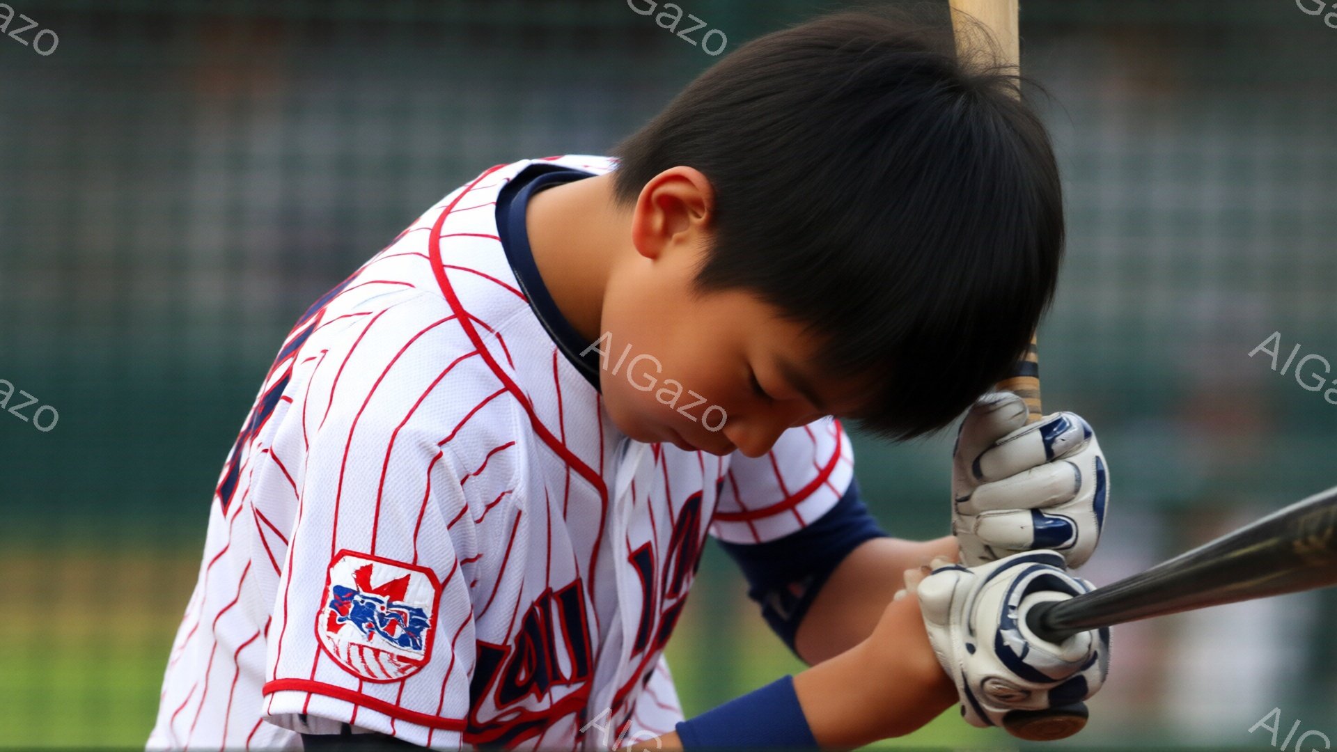 少年の野球選手がバットを握り、集中した表情で下を向いている。ストライプのユニフォームとキャップを着用し、左手にはリストバンドをつけている。背景には他の選手たちがぼやけて写り、野球場であることがわかる。