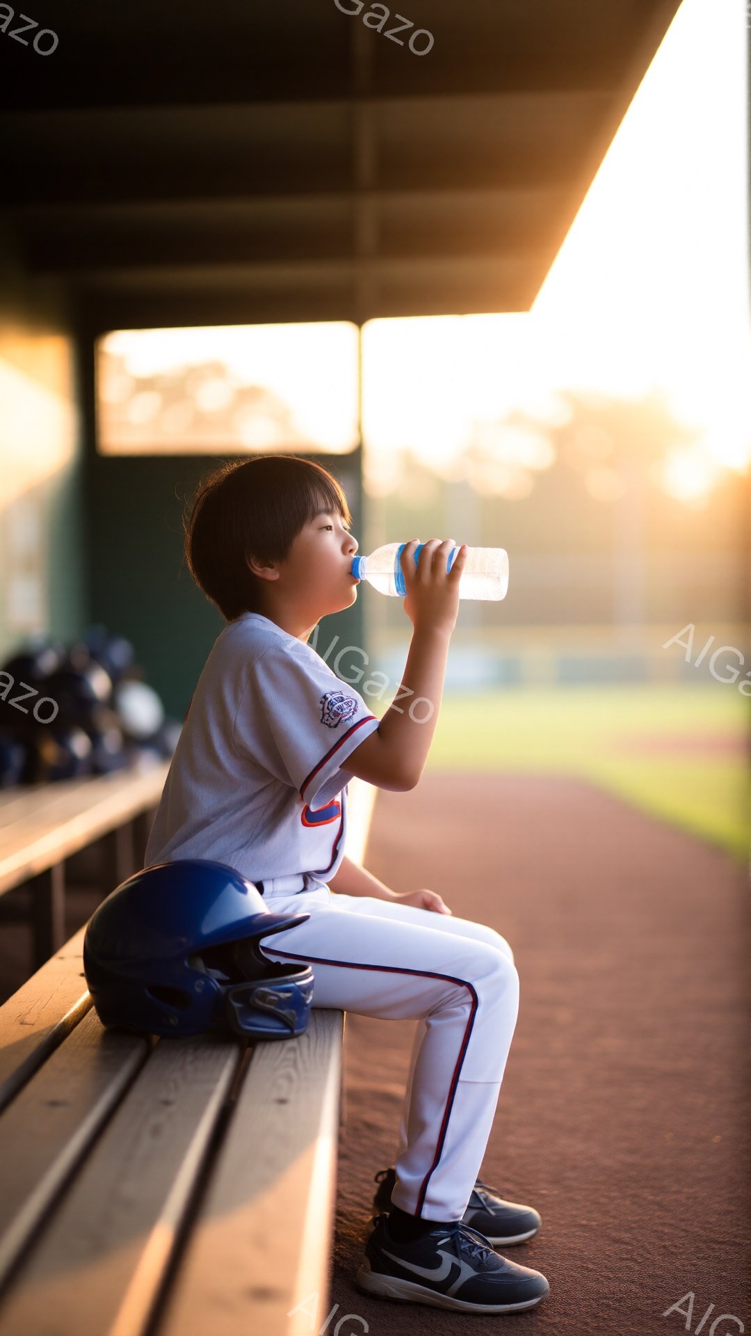 少年の野球選手がベンチに座り、水を飲んでいます。白いユニフォームに赤いライン、紺色のスパイクシューズを履き、ヘルメットがベンチに置かれています。背景は薄暗く、夕焼けのような光が差し込み、少年とその姿に温かい雰囲気を添えています。
