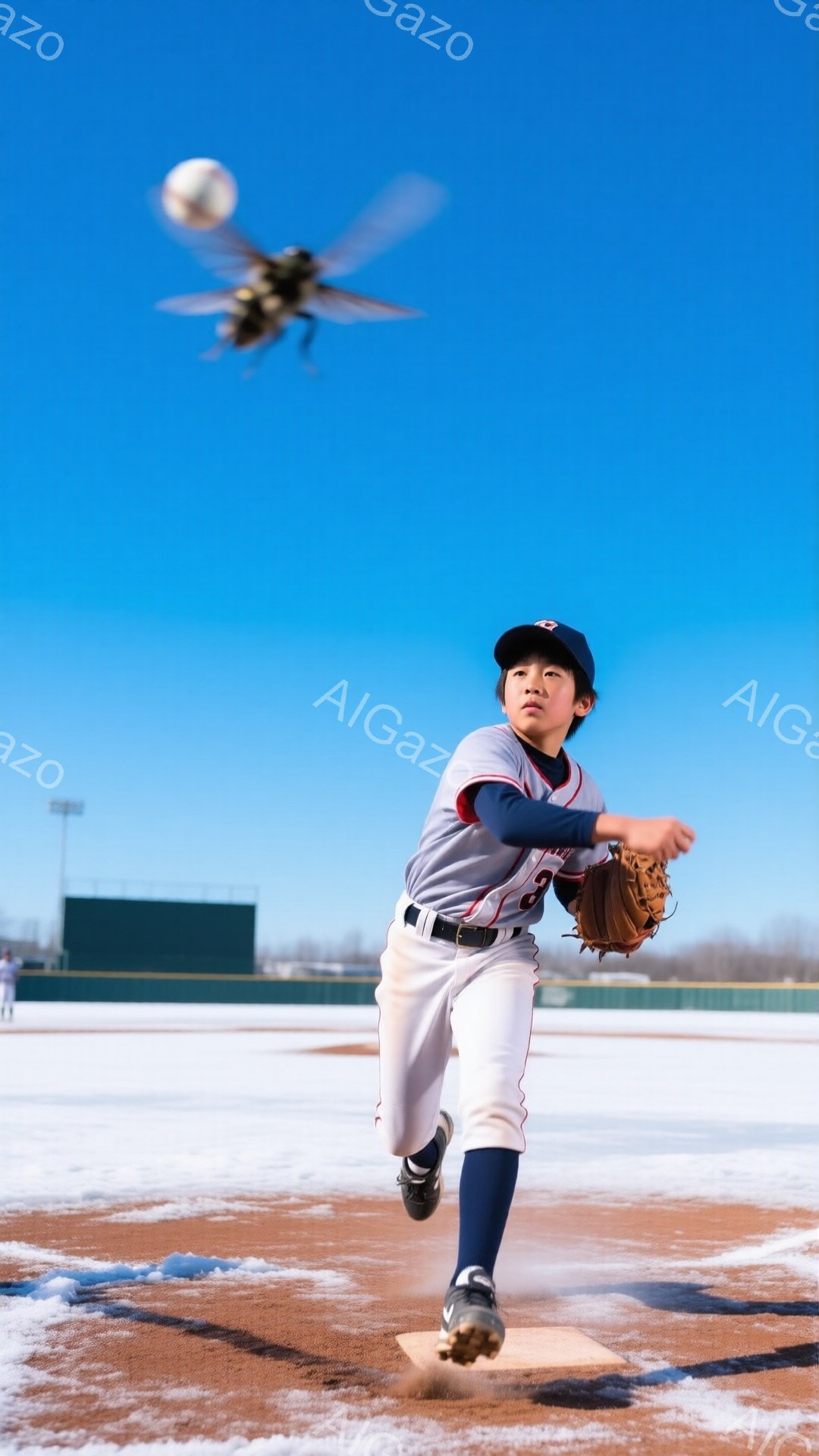 少年は野球場で滑り込み、ボールを捕獲しようとしています。彼は濃い紺色の野球ユニフォームと白いズボンを着用し、帽子をかぶっています。背景には緑の壁と青空が広がり、寒々とした冬の野球練習風景が描かれています。