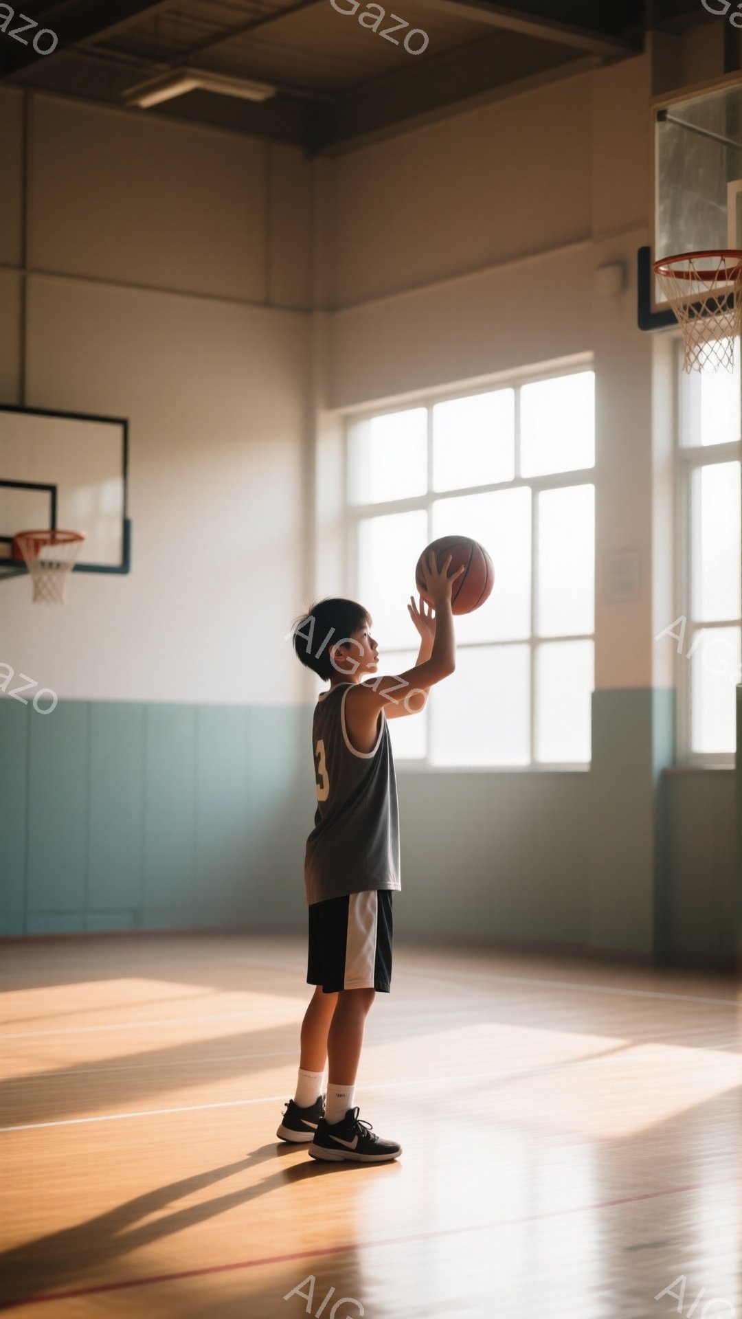 若い少年がバスケットボールコートでシュートの練習をしている。紺色のタンクトップと短パンを着用し、黒いスニーカーを履いている。背後には窓から差し込む光が床に差し込み、暖かく希望に満ちた雰囲気を生み出している。