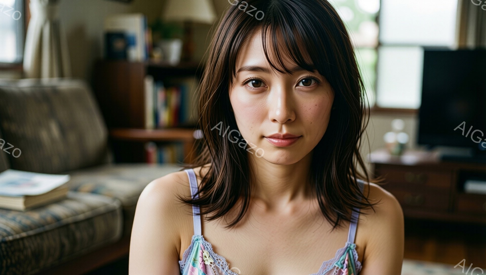 「茶髪のボブヘアで、前髪が少し長めの女性が写っています。淡い紫色のキャミソールを着ており、リラックスした表情で正面を見つめています。背景はリビングルームで、ソファ」は、2026年01月04日に作成されたAI生成画像です。 おしゃれをテーマとした高品質なビジュアル素材で、 1920×1088px の解像度で提供しています。 個人利用・商用利用ともに無料でダウンロード可能で、クレジット表記も不要です。