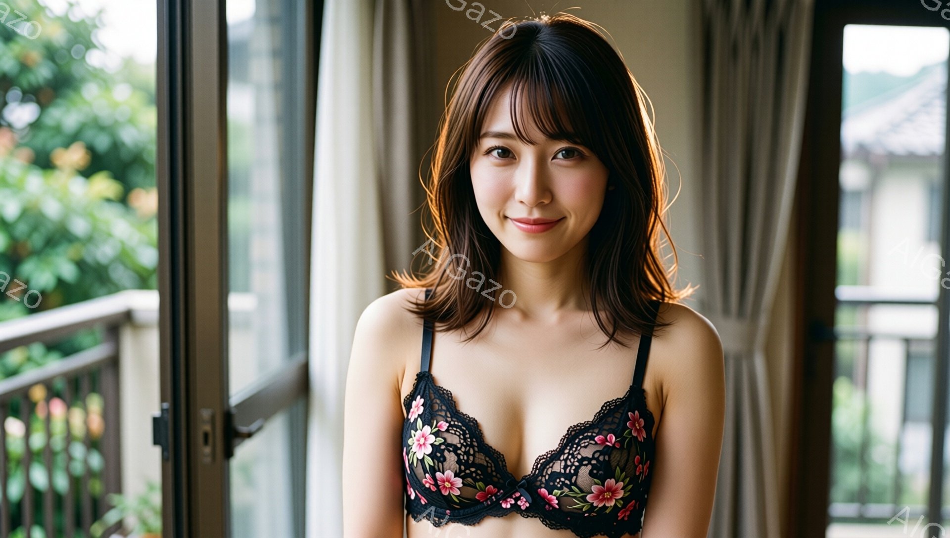 明るい自然光の中で、女性が花柄のレースブラレットを着用して立っている。彼女は肩までの長さの茶色の髪を持ち、微笑んでカメラを見つめている。背景には、都市の風景が見え、窓から差し込む光が室内に柔らかい雰囲気を醸し出している。