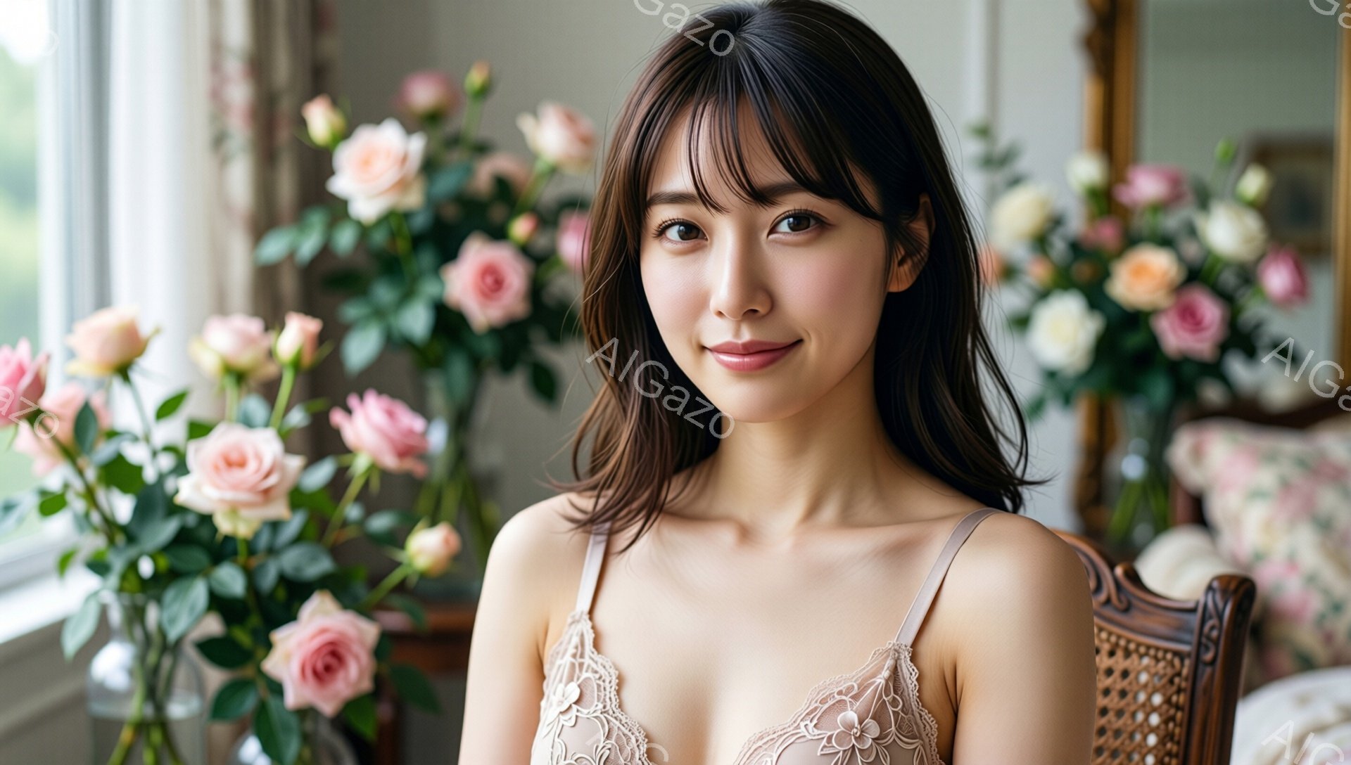 「長い茶色の髪をした若い女性が、白いレースのブラとショーツ姿でベッドに座っています。彼女は穏やかな表情でカメラを見つめており、背景には植物と、窓の外には桜が咲き誇」は、2026年01月04日に作成されたAI生成画像です。 ファッションをテーマとした高品質なビジュアル素材で、 1920×1088px の解像度で提供しています。 個人利用・商用利用ともに無料でダウンロード可能で、クレジット表記も不要です。