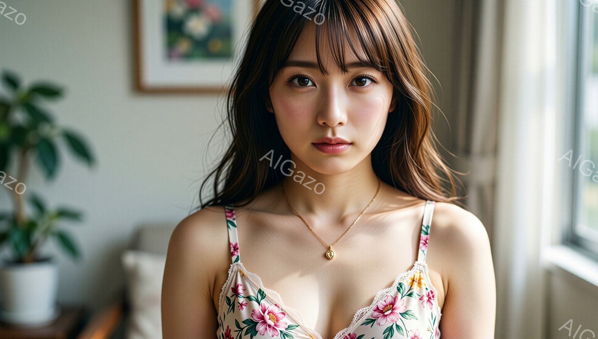 長い黒髪の女性が、花柄のキャミソールを着て、窓辺に立っています。彼女は少し微笑んでおり、穏やかな表情をしています。背景には、カーテンと窓から見える建物が見え、全体的に柔らかく暖かい雰囲気です。