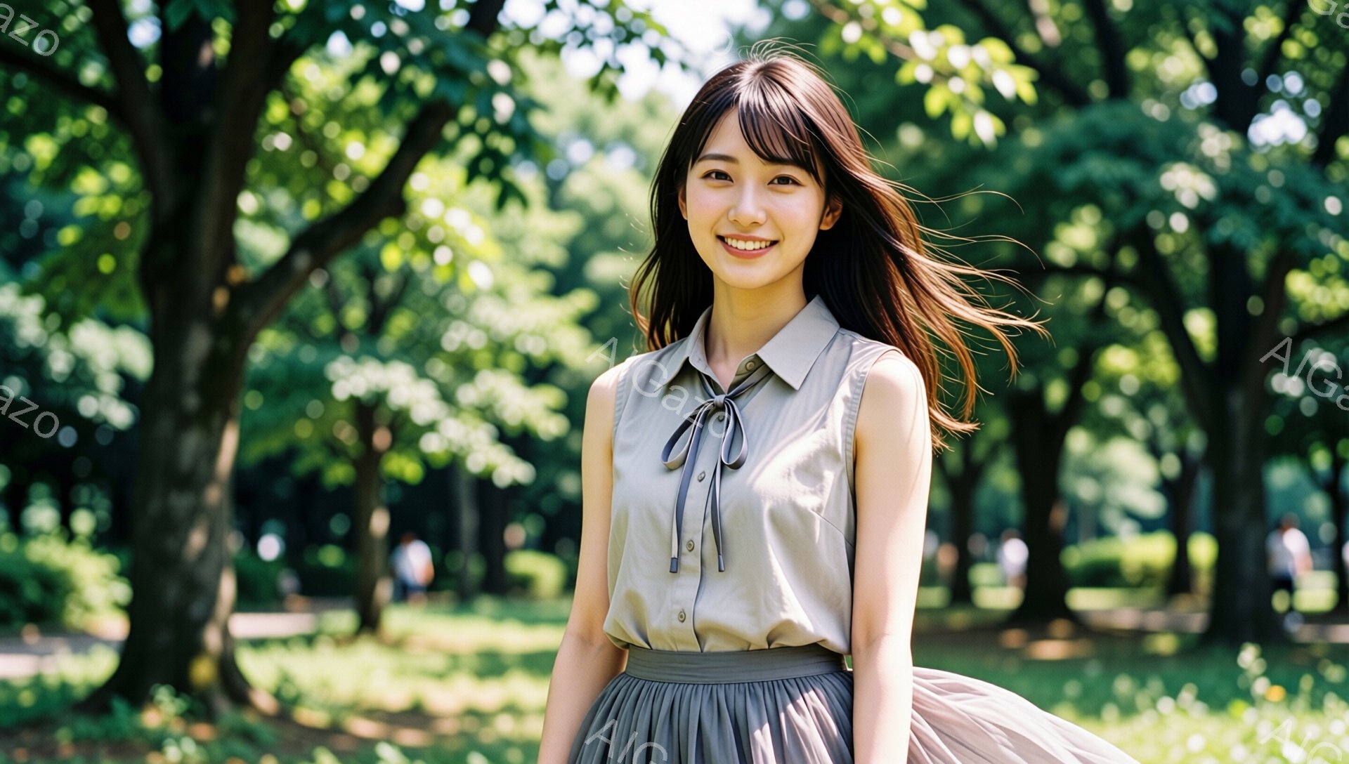 長い髪を風になびかせながら、笑顔の女性が写っている。ベージュのシャツとスカートを身に着け、公園の遊歩道を歩いているようだ。背景には緑豊かな木々と、ぼんやりと見える人々がおり、晴れた日の穏やかな雰囲気が漂っている。