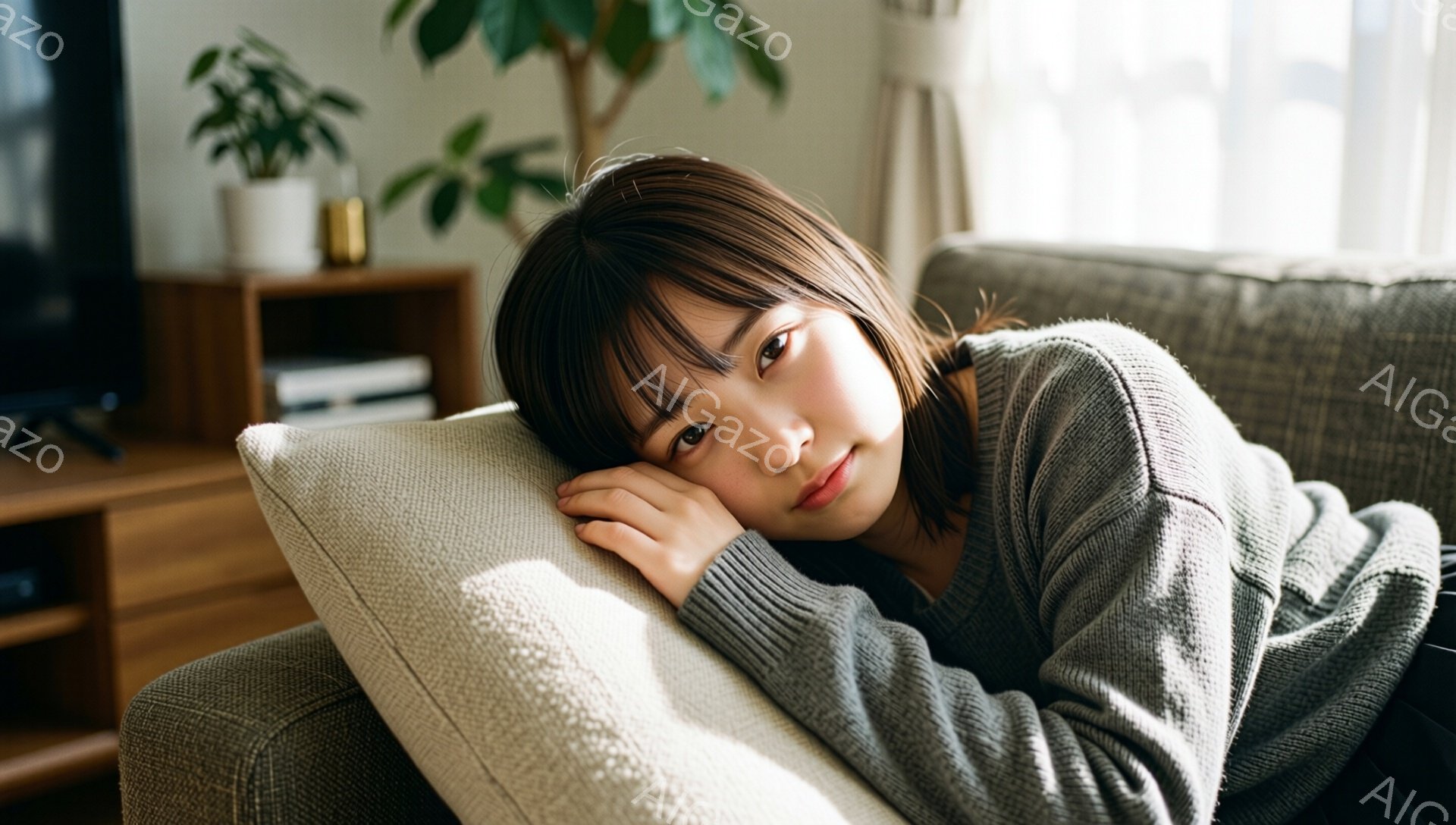暖色系のソファに、茶髪の若い女性が肘をついて横たわっています。彼女はベージュ色のセーターを着ており、前髪が少し長めのゆるやかなヘアスタイルです。背景には木製のキャビネットや植物が見え、窓から差し込む光が部屋全体を柔らかく照らしており、リラックスした穏やかな雰囲気が漂います。