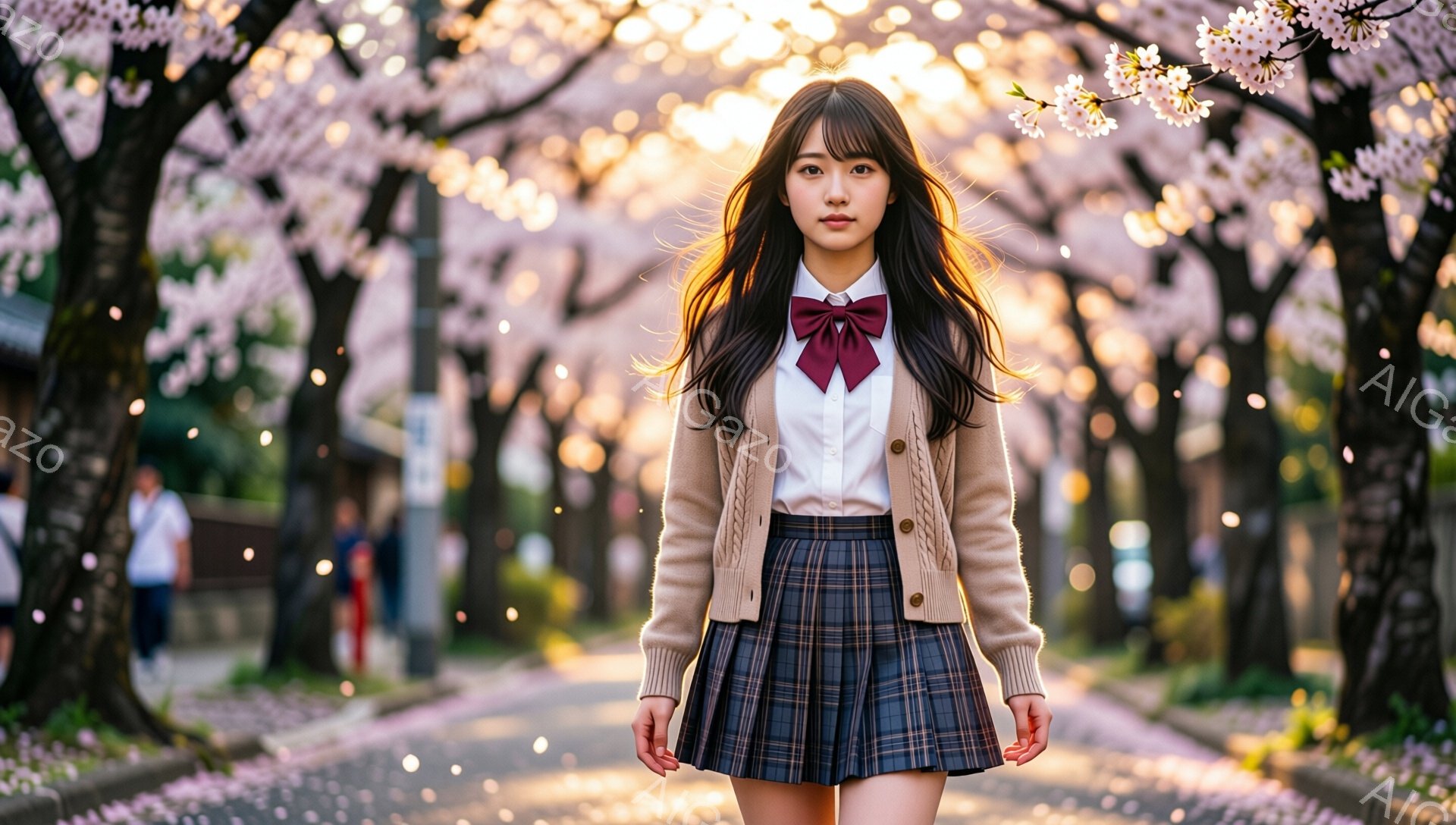 制服姿の若い女性が、桜並木の道を歩いている。明るい茶色の髪を肩まで伸ばし、タータンチェックのスカートと紺のリボンがアクセントになっている。背景には、満開の桜が咲き乱れ、暖かい日差しが降り注ぎ、春の穏やかな雰囲気を醸し出している。