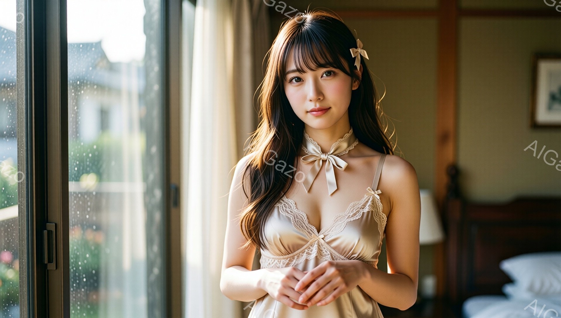 「明るい窓辺に立つ女性は、淡いベージュ色のキャミソールを着ています。彼女は長い茶髪を肩にかかるように下ろし、少し微笑んだ表情で何かを確かめるように胸元を触っていま」は、2026年01月05日に作成されたAI生成画像です。 キャミソールをテーマとした高品質なビジュアル素材で、 1920×1088px の解像度で提供しています。 個人利用・商用利用ともに無料でダウンロード可能で、クレジット表記も不要です。