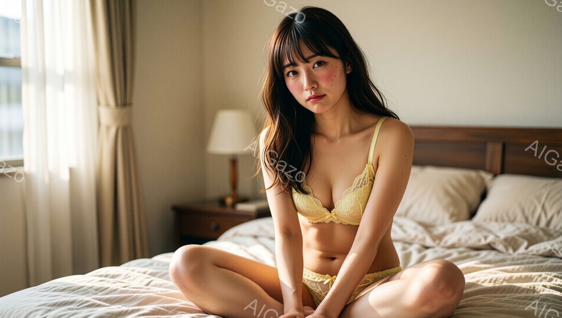 「長い茶色の髪を肩にかける女性が微笑みながらこちらを見ている。彼女はベージュのキャミソールを着ており、リラックスした雰囲気でベッドに座っているようだ。背景には木製」は、2026年01月06日に作成されたAI生成画像です。 カジュアルをテーマとした高品質なビジュアル素材で、 1920×1088px の解像度で提供しています。 個人利用・商用利用ともに無料でダウンロード可能で、クレジット表記も不要です。