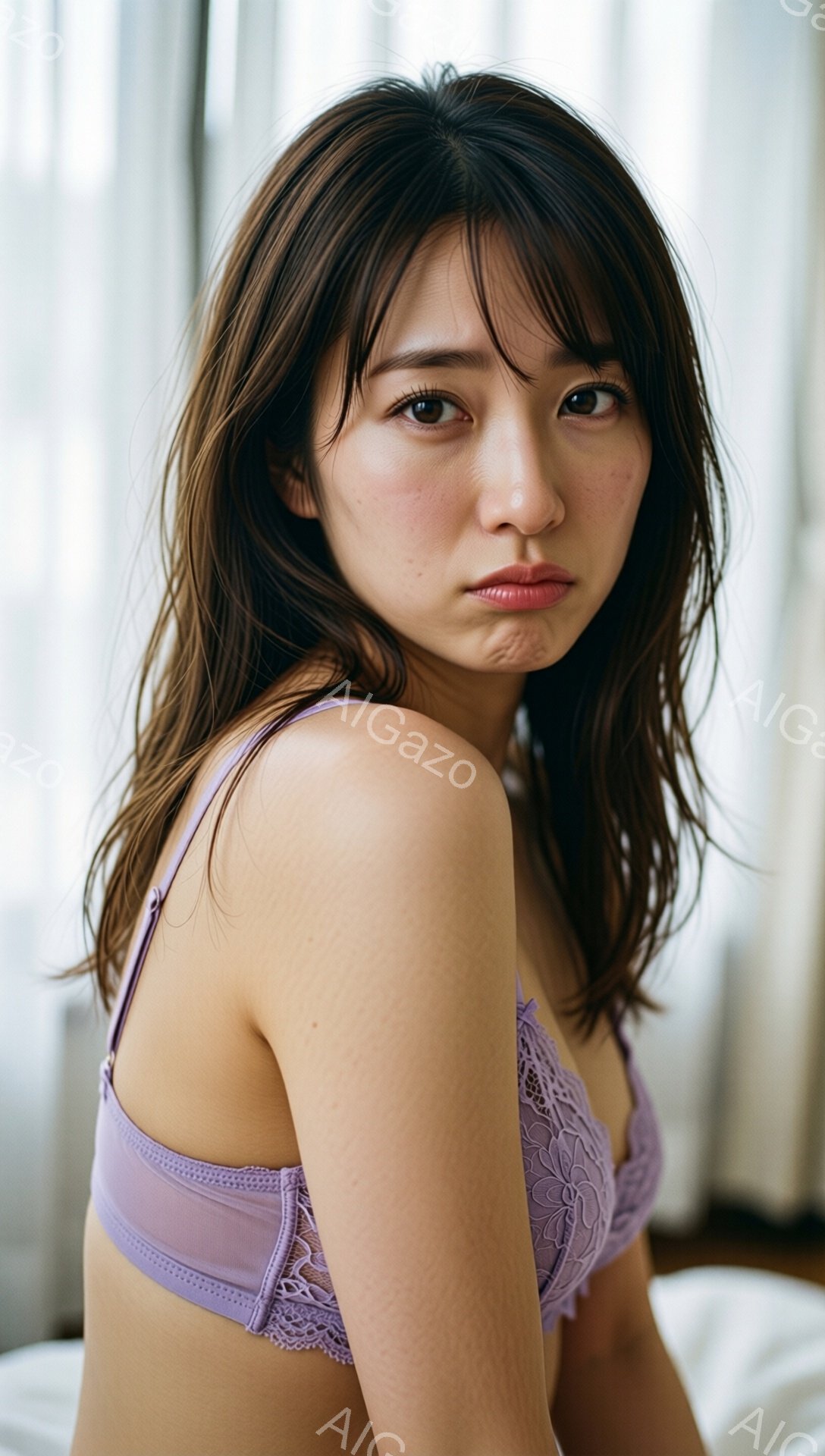 長いダークブラウンの髪が肩にかかり、少しうつむき加減でカメラを見つめる女性が写っている。淡い紫色のレースのブラレットを着用し、肌が露出している。背景はぼやけており、部屋の一角、おそらくベッドの上で、自然光が差し込んでいる様子がうかがえる。