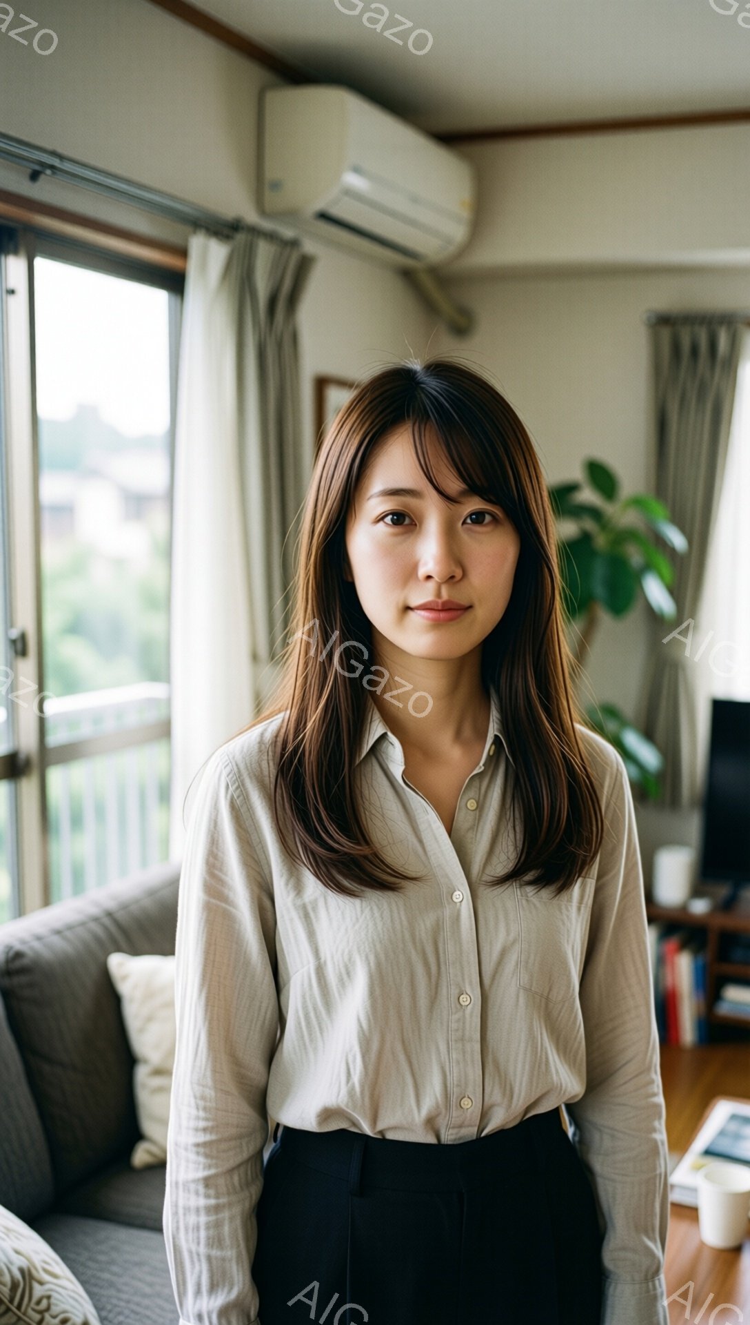 「明るい室内で、茶色のシャツと黒いズボンを着用した若い女性が立っている。彼女は軽く微笑み、肩までの長さの髪はゆるやかにウェーブがかかっている。背景には窓があり、緑」は、2026年01月06日に作成されたAI生成画像です。 カジュアルをテーマとした高品質なビジュアル素材で、 1088×1920px の解像度で提供しています。 個人利用・商用利用ともに無料でダウンロード可能で、クレジット表記も不要です。