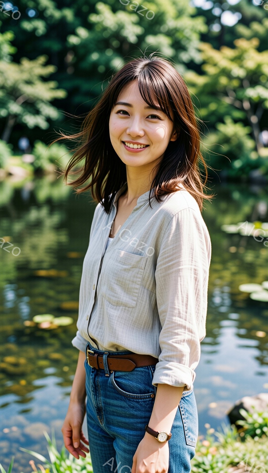 彼女はベージュのカーディガン、白いブラウス、アンクル丈のワイドパンツ、そして茶色の革靴を身につけている。少し微笑んでおり、リラックスした様子で遊歩道を歩いている。背景には緑豊かな木々と遊歩道が広がり、穏やかで暖かい日差しが差し込んでいる。