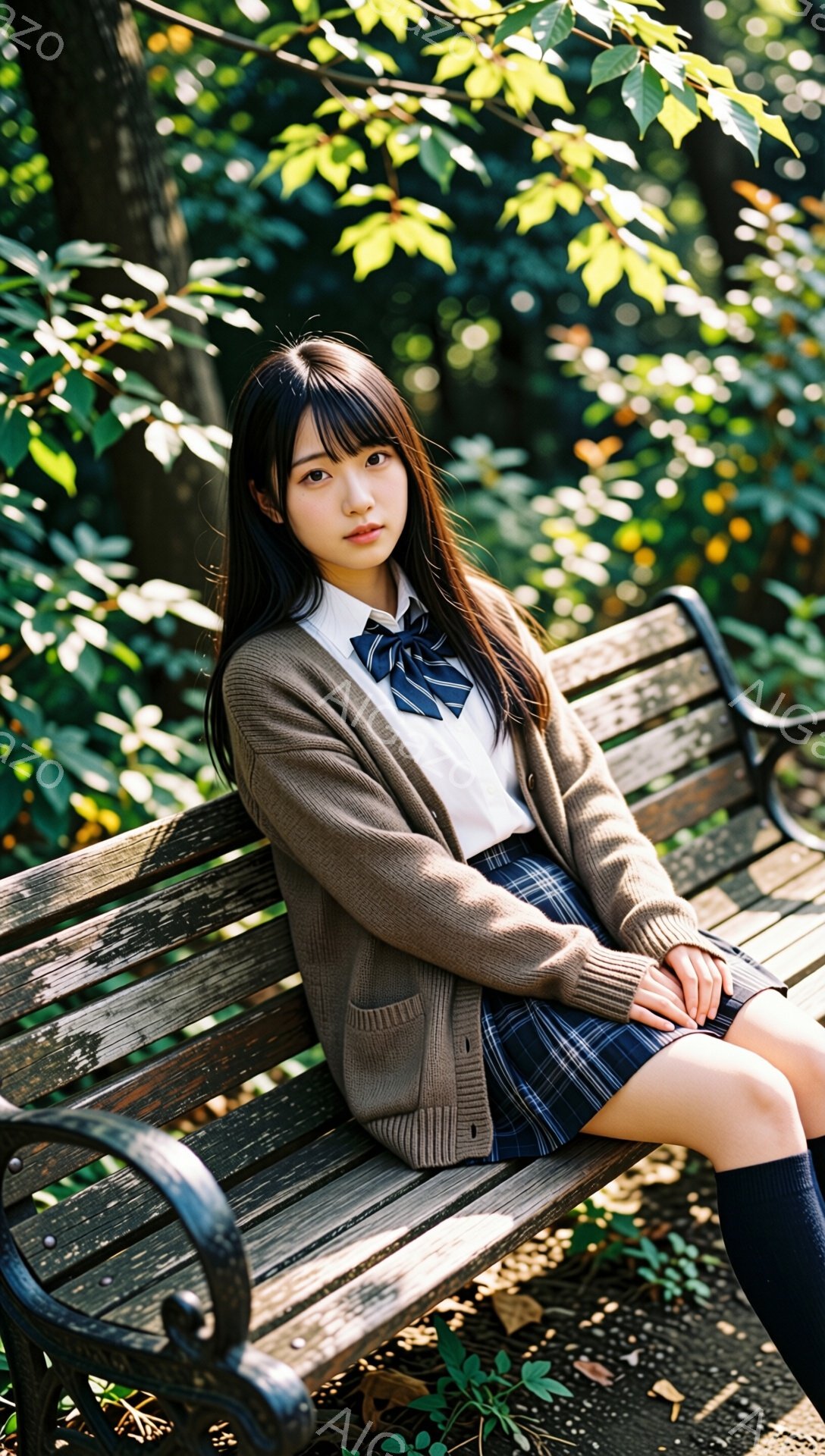 「若い女性が公園のベンチに座っています。彼女はベージュのカーディガン、白いシャツ、チェック柄のスカート、黒いソックスを着用しており、制服のような服装です。彼女は少」は、2026年01月06日に作成されたAI生成画像です。 カーディガンをテーマとした高品質なビジュアル素材で、 1088×1920px の解像度で提供しています。 個人利用・商用利用ともに無料でダウンロード可能で、クレジット表記も不要です。