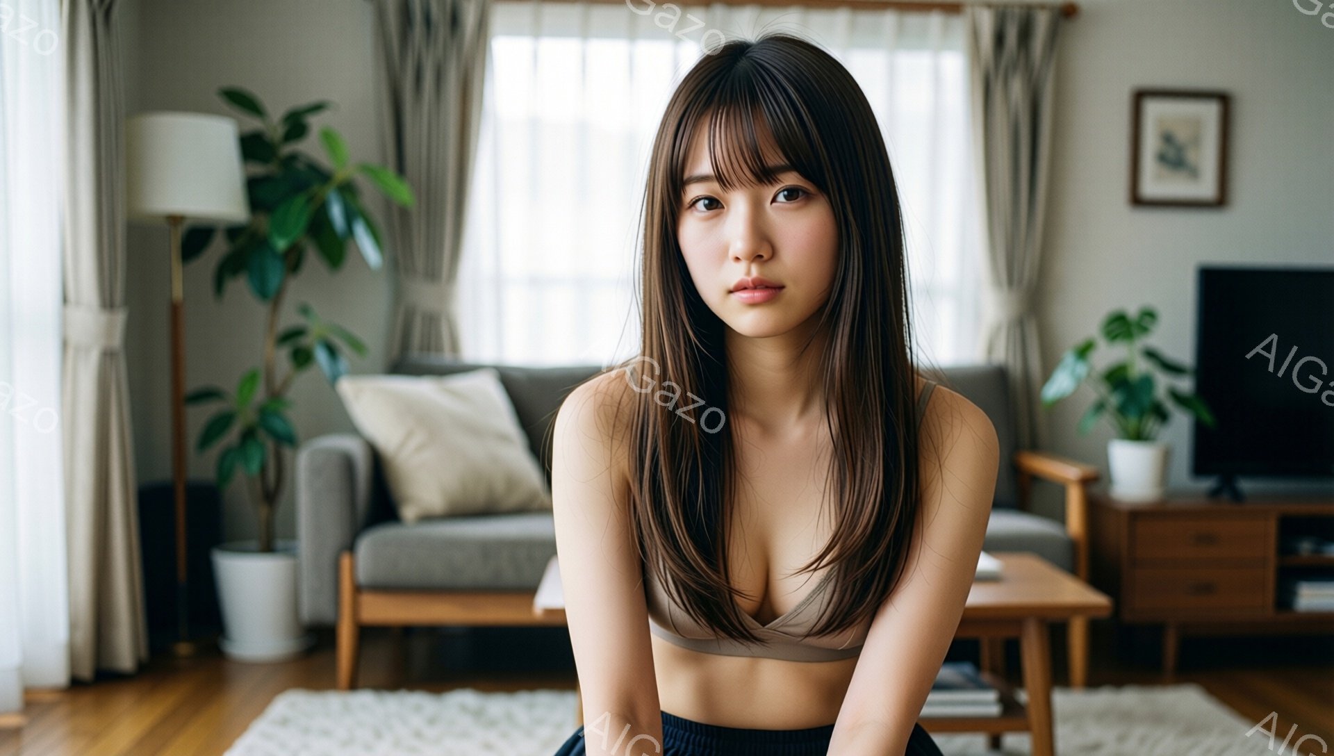 「長い黒髪で前髪のある若い女性が、グレーのタンクトップと黒いレギンスを身に着けて座っています。彼女は微笑んでおり、リラックスした雰囲気です。背景には木製の床、クリ」は、2026年01月06日に作成されたAI生成画像です。 カジュアルをテーマとした高品質なビジュアル素材で、 1920×1088px の解像度で提供しています。 個人利用・商用利用ともに無料でダウンロード可能で、クレジット表記も不要です。