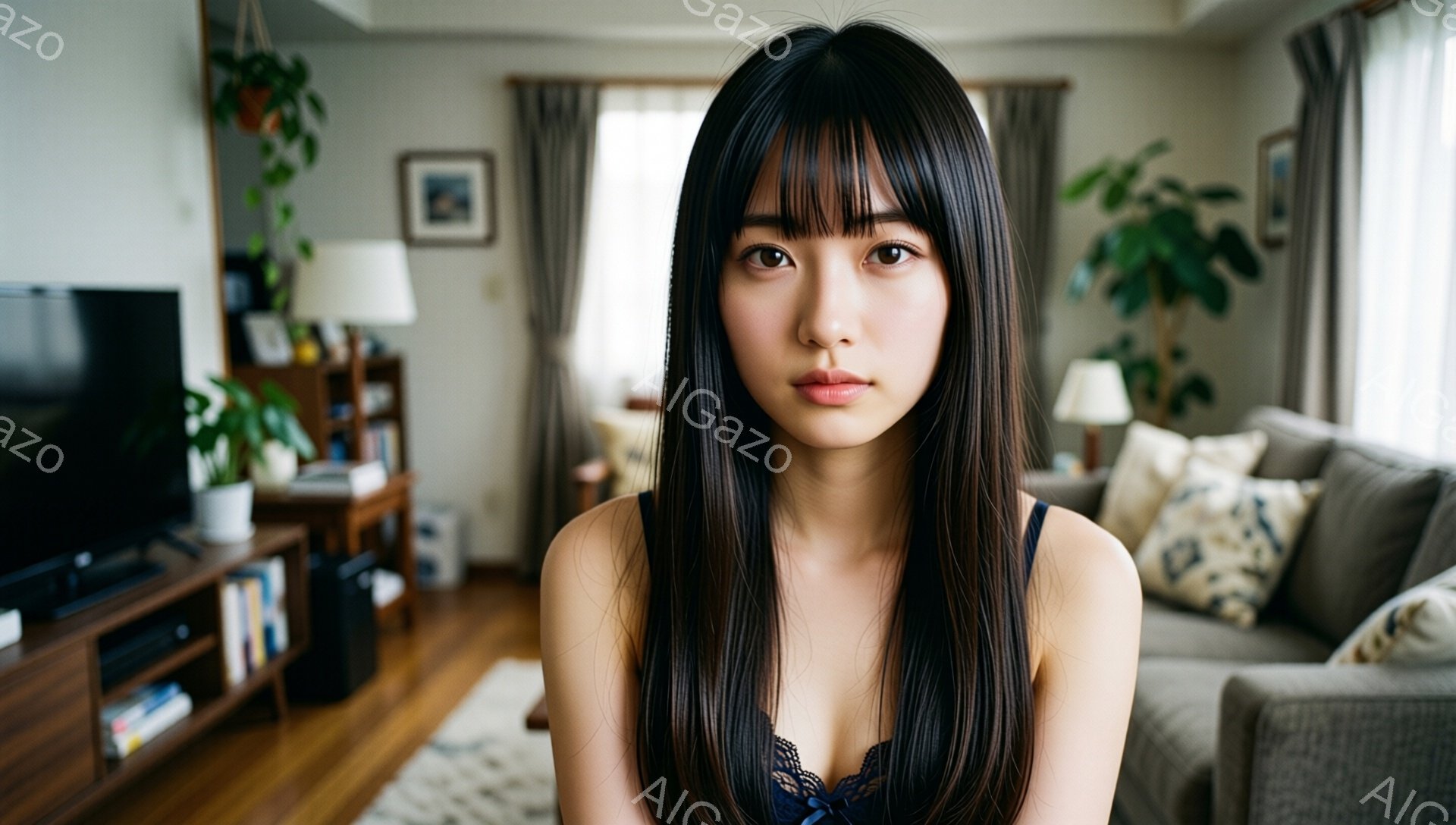 長い黒髪で前髪が目の上まで伸びた女性が、レースのブラレットを着用して正面を見つめています。彼女はリラックスした姿勢で、明るいリビングルームのソファに座っています。背景にはテレビ、観葉植物、そして柔らかな光が差し込む窓が見え、全体的に穏やかで落ち着いた雰囲気です。