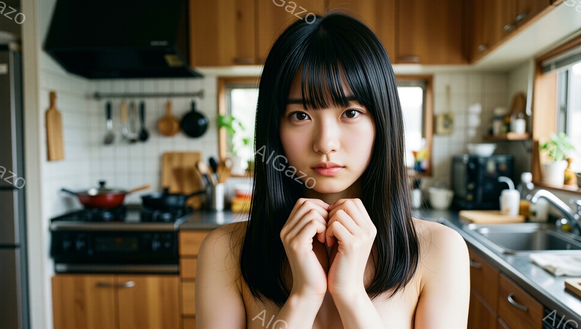 長い黒髪の女性がキッチンで胸の前で両手を組んで立っている。彼女は上半身裸で、穏やかな表情をしており、背景には木製のキッチンキャビネットと窓から見える緑の景色がぼやけて見える。 全体的に暖かく、落ち着いた雰囲気である。