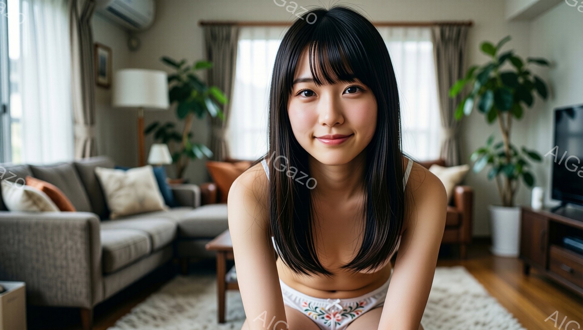 「黒髪をハーフアップにした若い女性が、白いレースのキャミソールを着てベッドに座っています。彼女はカメラに向かって微笑んでおり、リラックスした表情をしています。背景」は、2026年01月06日に作成されたAI生成画像です。 キャミソールをテーマとした高品質なビジュアル素材で、 1920×1088px の解像度で提供しています。 個人利用・商用利用ともに無料でダウンロード可能で、クレジット表記も不要です。