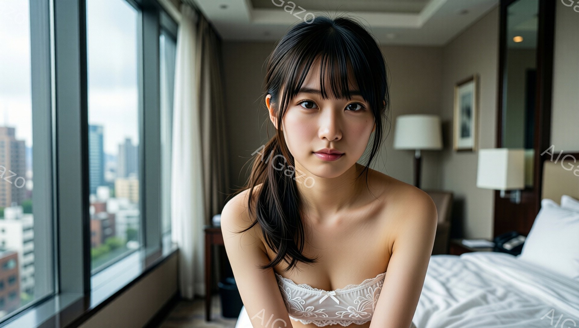 黒髪をハーフアップにした若い女性が、白いレースのキャミソールを着てベッドに座っています。彼女はカメラに向かって微笑んでおり、リラックスした表情をしています。背景には高層ビル群と緑が見え、部屋は明るく開放的な雰囲気です。