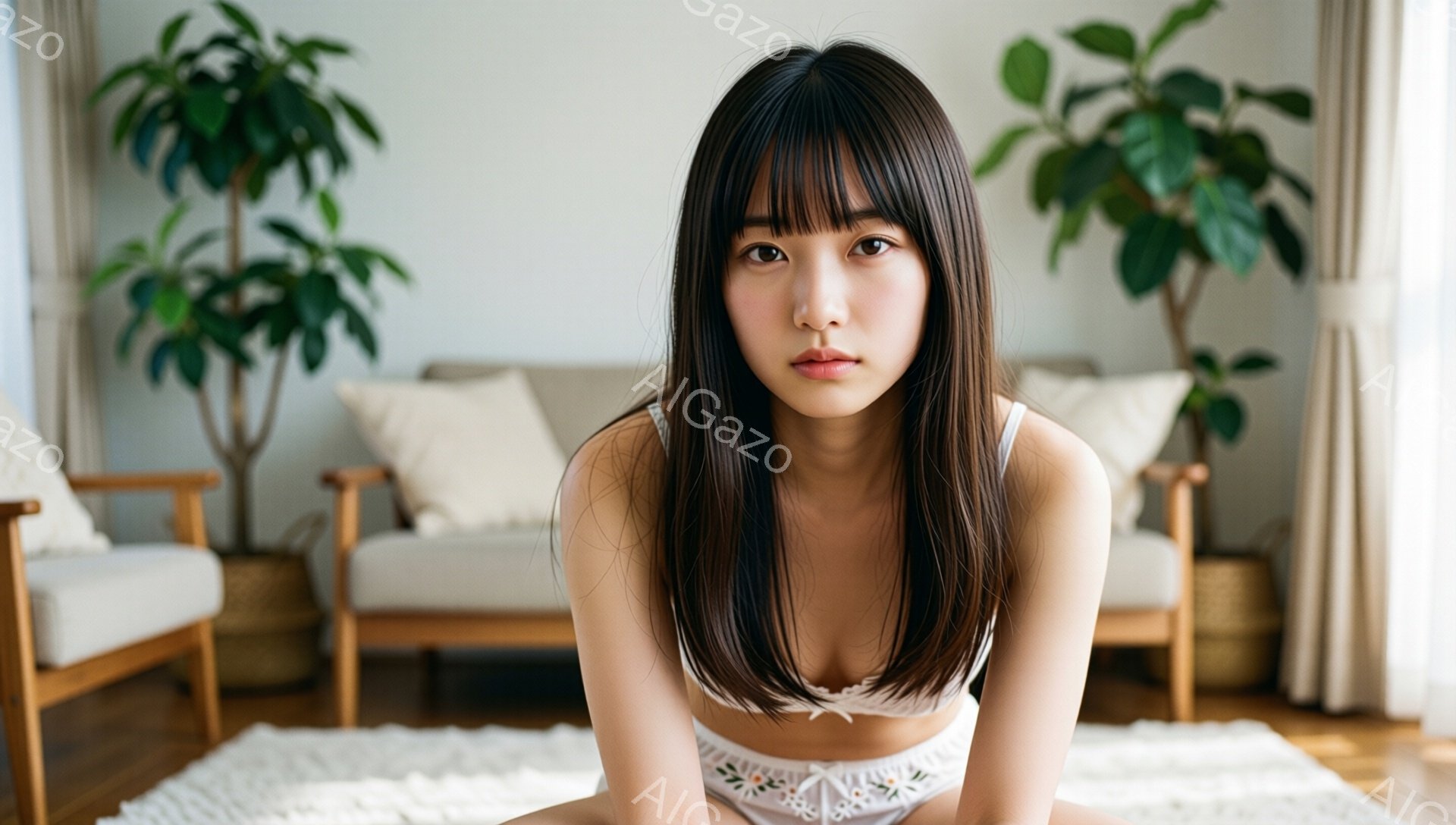 長い黒髪で、前髪が眉毛にかかるようにカットされた若い女性が写っている。白いレースのキャミソールを着て、リラックスした姿勢で座っており、わずかに微笑んでいる。背景には、木製のフレームに柔らかい色のクッションが置かれたソファ、大きな植物、そして明るい自然光が差し込む窓が見える、温かく居心地の良いリビングルームの様子が写っている。