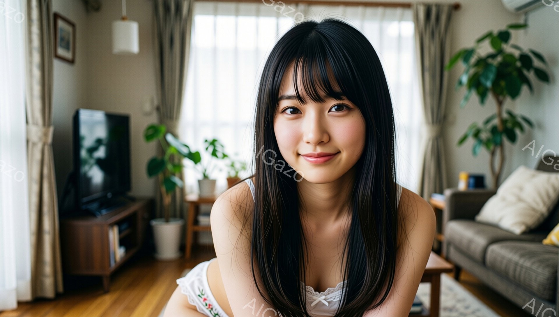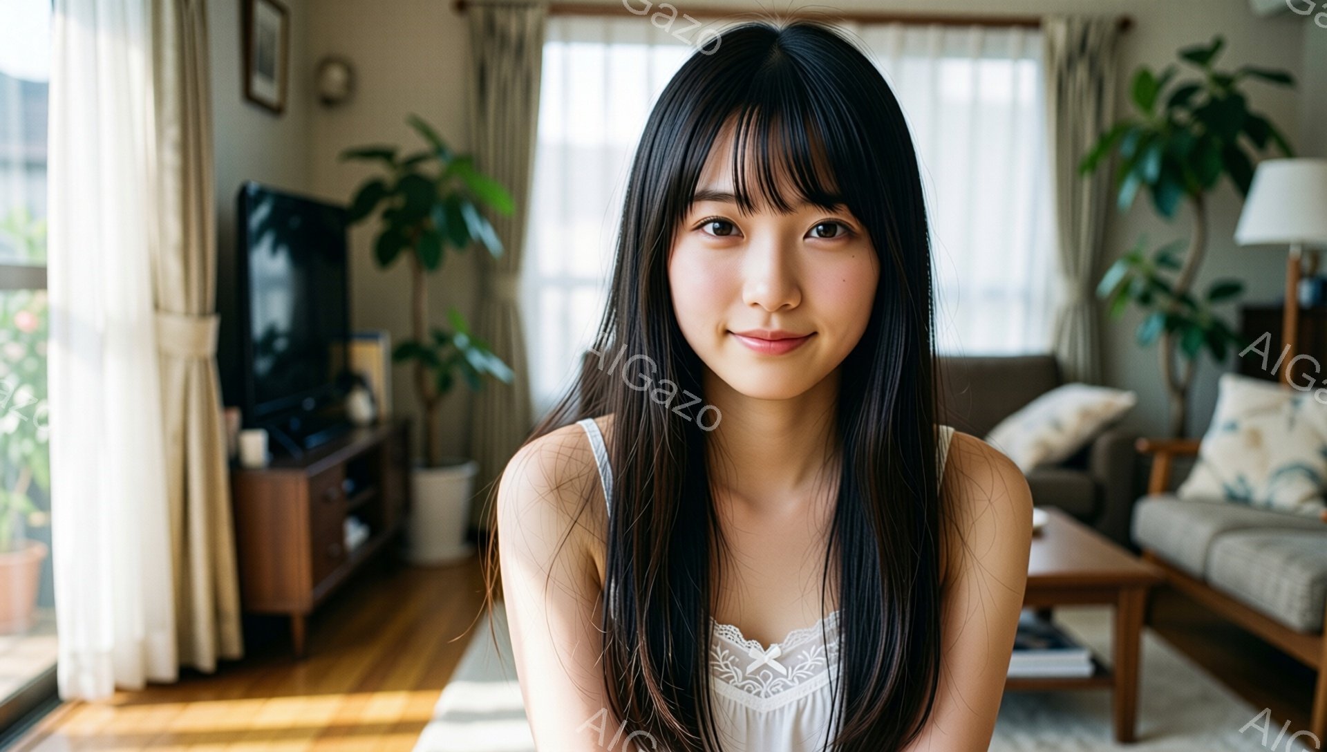 長い黒髪をなびかせた女性が、穏やかな笑顔でこちらを見ている。白いレースのキャミソールを着ており、背景には窓から差し込む光が暖かく、リビングルームが写っている。全体的にリラックスした、家庭的な雰囲気が漂っている。