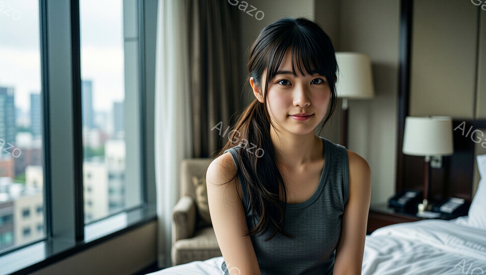 「長い黒髪をポニーテールにした若い女性が、ベッドに座ってこちらを見ています。グレーのキャミソールを着ており、表情はわずかに微笑んでいるように見えます。背景には高層」は、2026年01月06日に作成されたAI生成画像です。 キャミソールをテーマとした高品質なビジュアル素材で、 1920×1088px の解像度で提供しています。 個人利用・商用利用ともに無料でダウンロード可能で、クレジット表記も不要です。