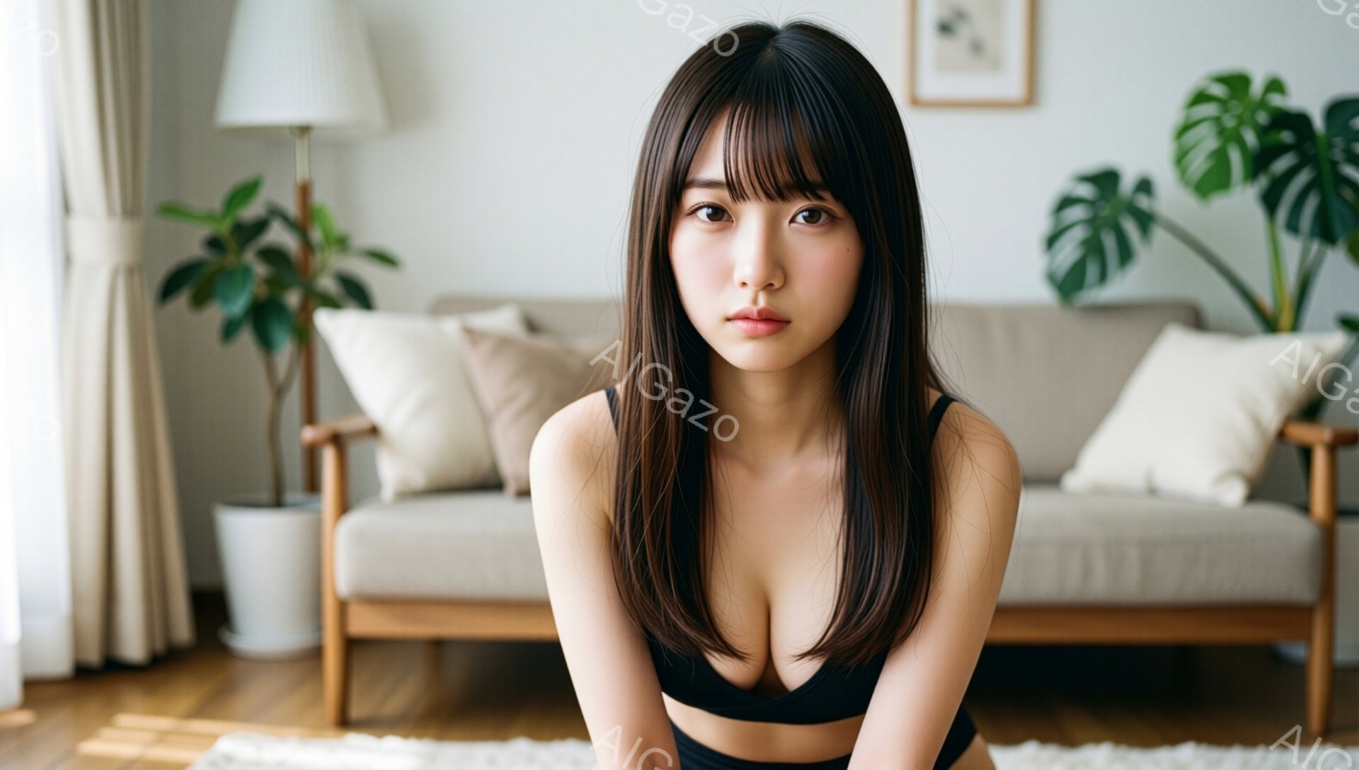 「長い黒髪をセンターパートにした若い女性が正面を向いて微笑んでいます。彼女は肩から胸元が露出した白いトップスを着ており、背景にはリビングルームらしき空間が見えます」は、2026年01月06日に作成されたAI生成画像です。 トップスをテーマとした高品質なビジュアル素材で、 1920×1088px の解像度で提供しています。 個人利用・商用利用ともに無料でダウンロード可能で、クレジット表記も不要です。