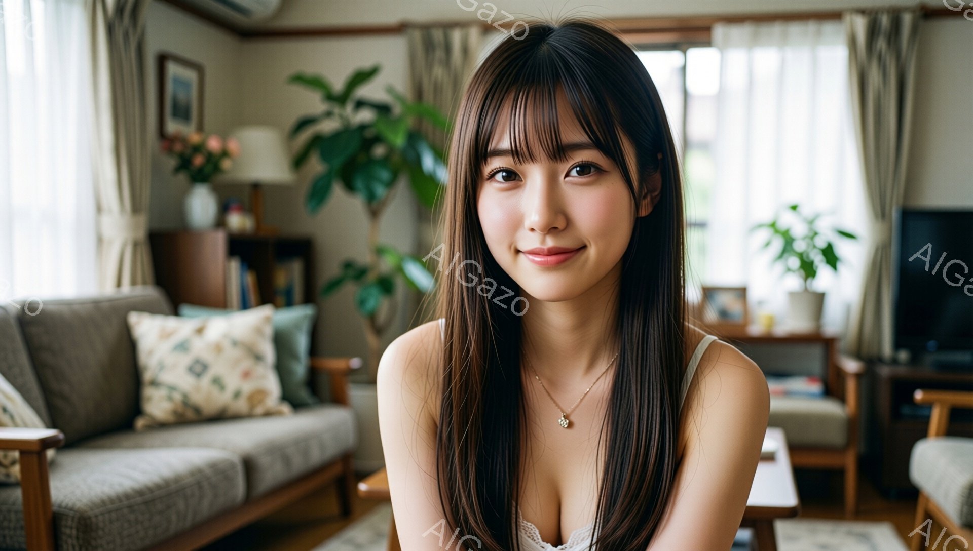 「長い黒髪の女性が、黒いレースのブラレット姿で正面を見つめて微笑んでいます。彼女はリラックスした姿勢で座っており、背景には明るいリビングルーム、ソファー、窓、そし」は、2026年01月06日に作成されたAI生成画像です。 カジュアルをテーマとした高品質なビジュアル素材で、 1920×1088px の解像度で提供しています。 個人利用・商用利用ともに無料でダウンロード可能で、クレジット表記も不要です。