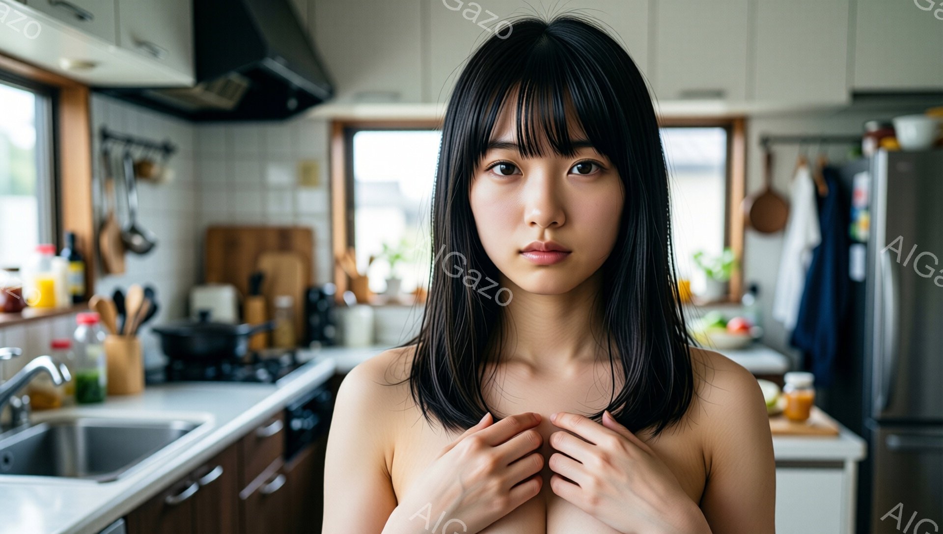黒髪の女性が、キッチンで胸の前で両手を組んで立っている。彼女は肩出しの服装で、前髪を伸ばしたボブヘアスタイルをしている。背景にはキッチン用品や調理器具が並び、暖色系の照明と木製の家具が落ち着いた雰囲気を醸し出している。