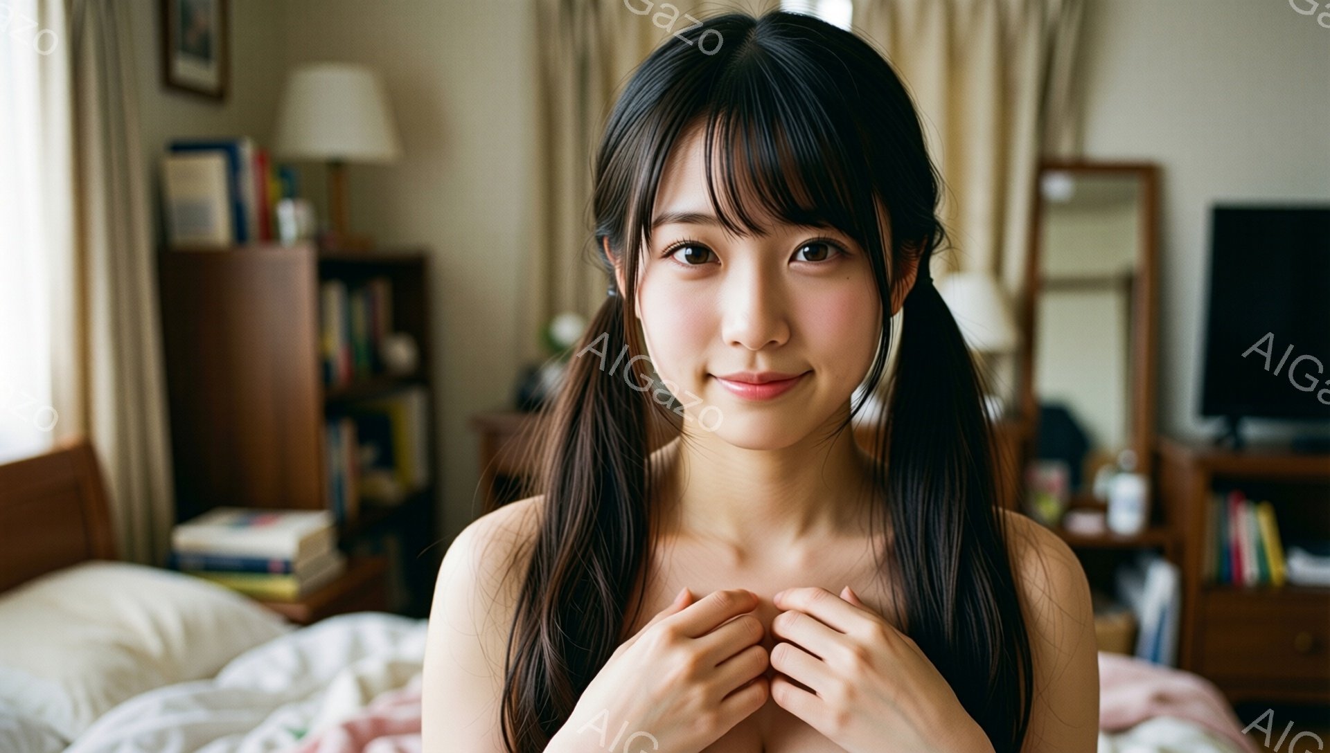 「茶髪の巻き髪で、二つに結んだ女性が写っています。彼女は白いシーツのベッドに座り、両手を胸の前で組み、微笑んでいます。背景には木製の棚と窓があり、室内は明るく、穏」は、2026年01月06日に作成されたAI生成画像です。 カジュアルをテーマとした高品質なビジュアル素材で、 1920×1088px の解像度で提供しています。 個人利用・商用利用ともに無料でダウンロード可能で、クレジット表記も不要です。
