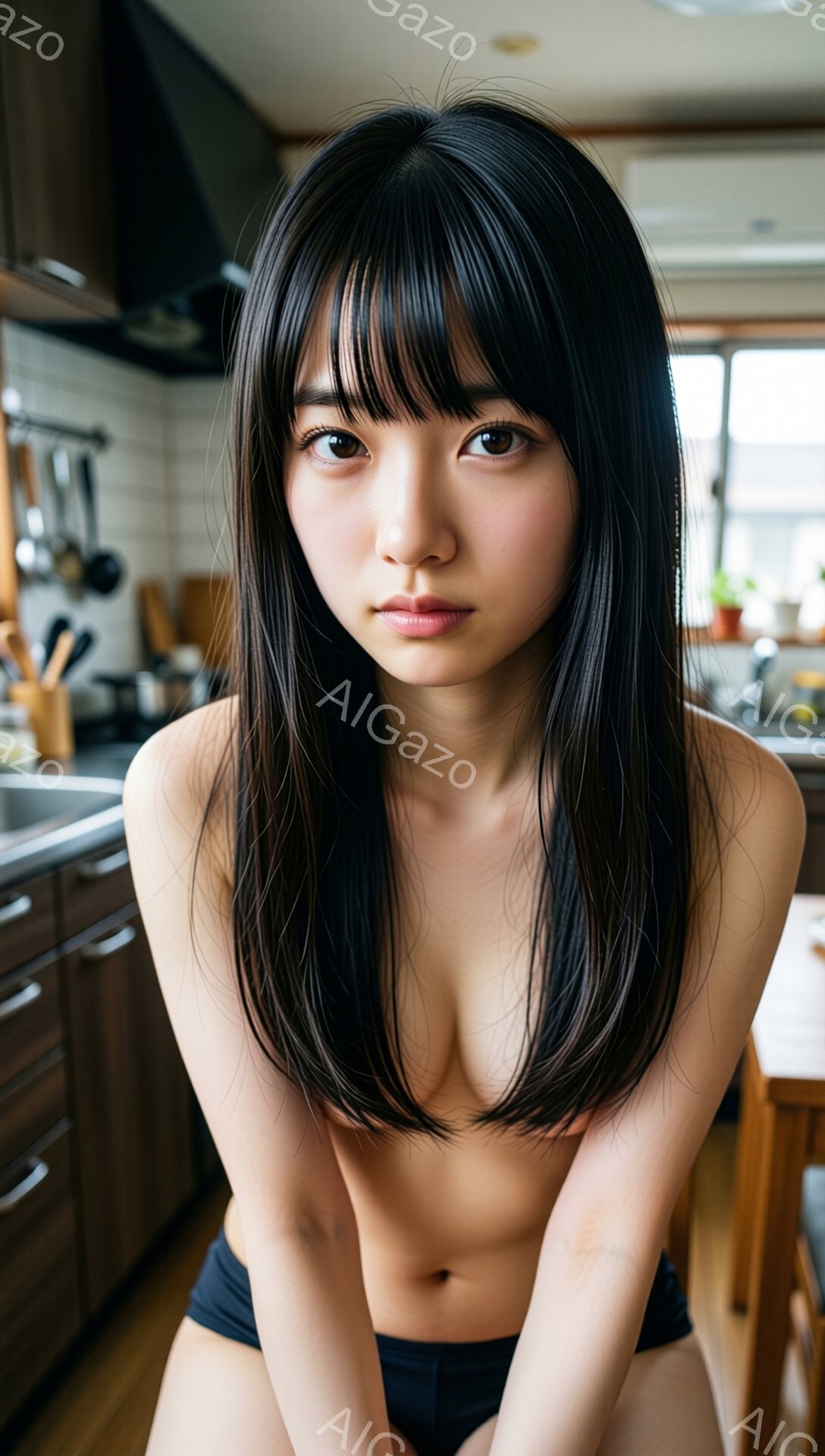 「黒いレースのブラとパンティーを身に着けた女性が写っている。彼女は長い黒髪でストレートに下ろし、前髪は眉毛にかかっている。背景はキッチンで、窓からは自然光が差し込」は、2026年01月06日に作成されたAI生成画像です。 インドアをテーマとした高品質なビジュアル素材で、 1088×1920px の解像度で提供しています。 個人利用・商用利用ともに無料でダウンロード可能で、クレジット表記も不要です。