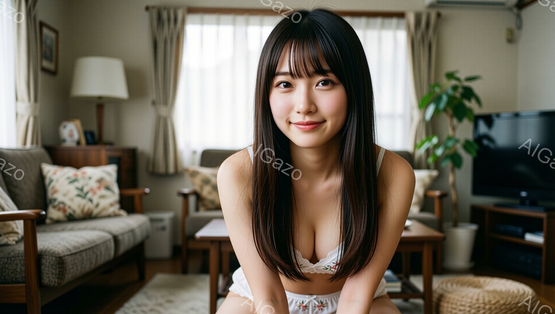 「長い黒髪をセンターパートにした女性が、白い花柄のキャミソールを着て、リラックスした表情でこちらを見ている。彼女は柔らかい色の絨毯の上に座り、背後にリビングルーム」は、2026年01月06日に作成されたAI生成画像です。 キャミソールをテーマとした高品質なビジュアル素材で、 1920×1088px の解像度で提供しています。 個人利用・商用利用ともに無料でダウンロード可能で、クレジット表記も不要です。