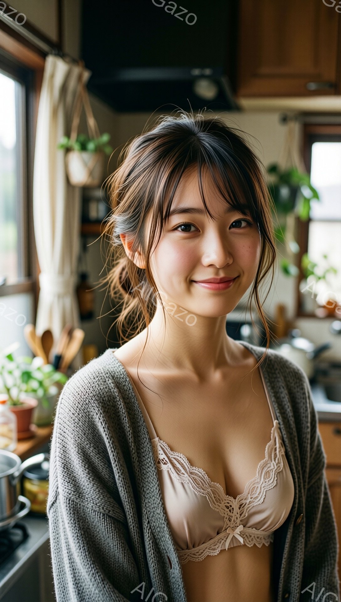 明るいキッチンを背景に、黒いレースのブラレットとショーツを身に着けた若い女性が写っている。彼女は髪を無造作にまとめ、微笑みを浮かべながらカメラを見つめている。背景にはキッチンカウンターや食器棚があり、室内は暖かく、家庭的な雰囲気が漂っている。