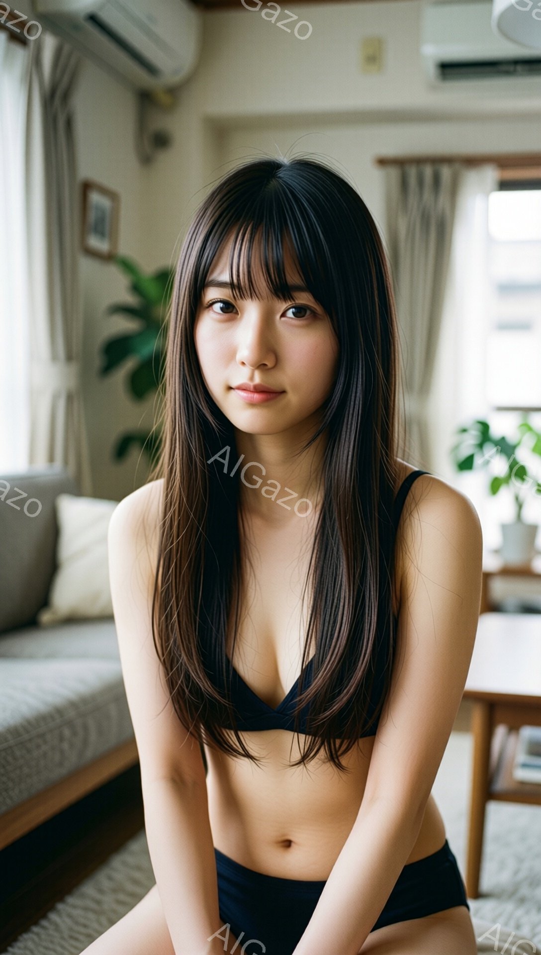 「長い茶色の髪はストレートで、前髪が目にかかっています。彼女は上半身裸で、黒いショーツを着用しており、座って正面を見つめています。背景には木製の床、カーテン、そし」は、2026年01月06日に作成されたAI生成画像です。 カーテンをテーマとした高品質なビジュアル素材で、 1088×1920px の解像度で提供しています。 個人利用・商用利用ともに無料でダウンロード可能で、クレジット表記も不要です。