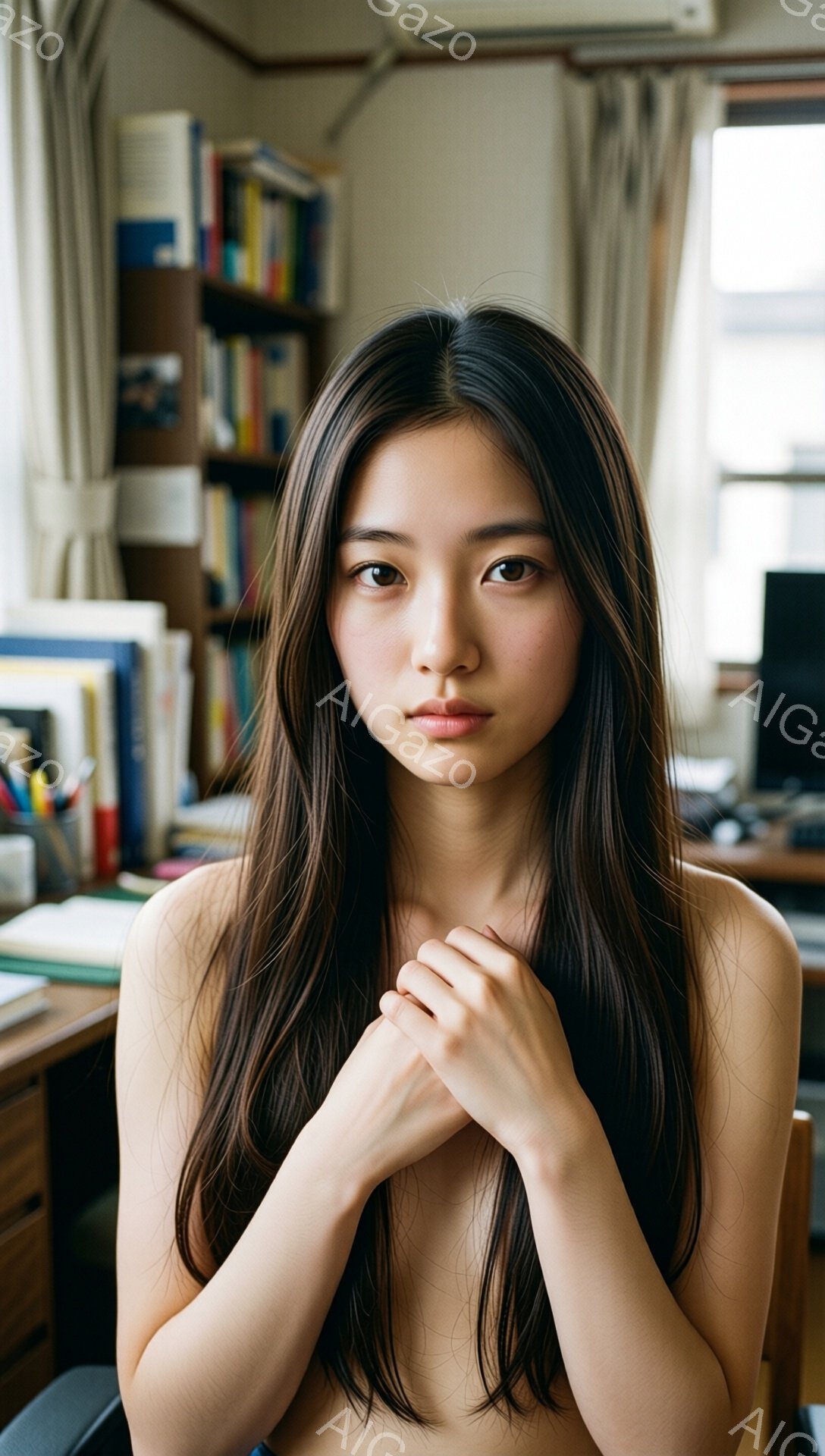 「長い茶色の髪をハーフアップにした若い女性が、白いベッドの前に立っています。彼女は上半身を露出しており、両手で胸元を抱えています。背景には、柔らかい光が差し込む室」は、2026年01月06日に作成されたAI生成画像です。 インテリアをテーマとした高品質なビジュアル素材で、 1088×1920px の解像度で提供しています。 個人利用・商用利用ともに無料でダウンロード可能で、クレジット表記も不要です。