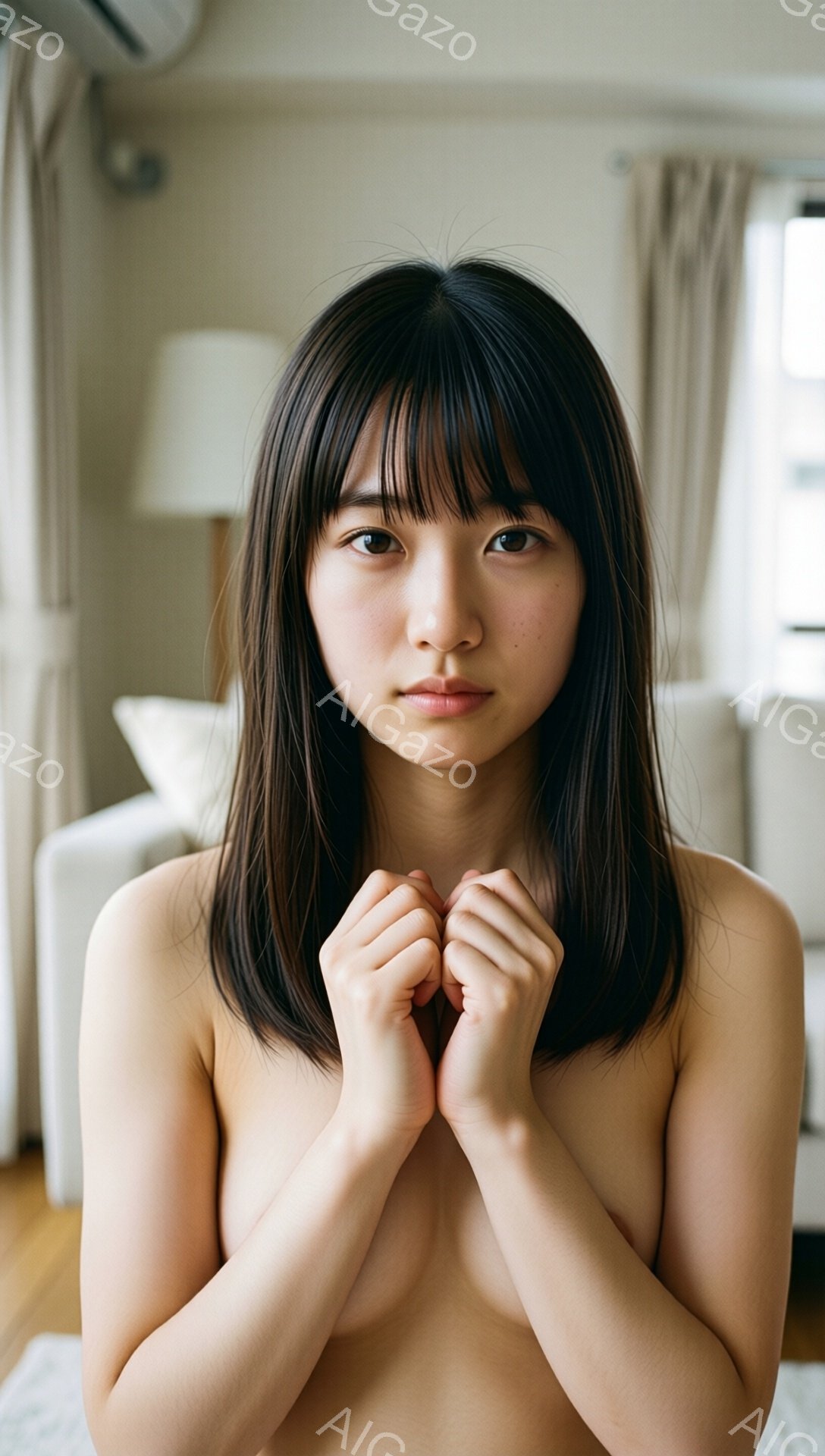 長い黒髪をセンターパートにした若い女性が、胸の前で両手を重ねてこちらを見つめています。上半身は裸で、背景には窓から差し込む光と、植物やソファが見えるリビングルームがぼんやりと写っています。全体的に、柔らかな光と彼女の控えめな表情が、静かで内省的な雰囲気を醸し出しています。