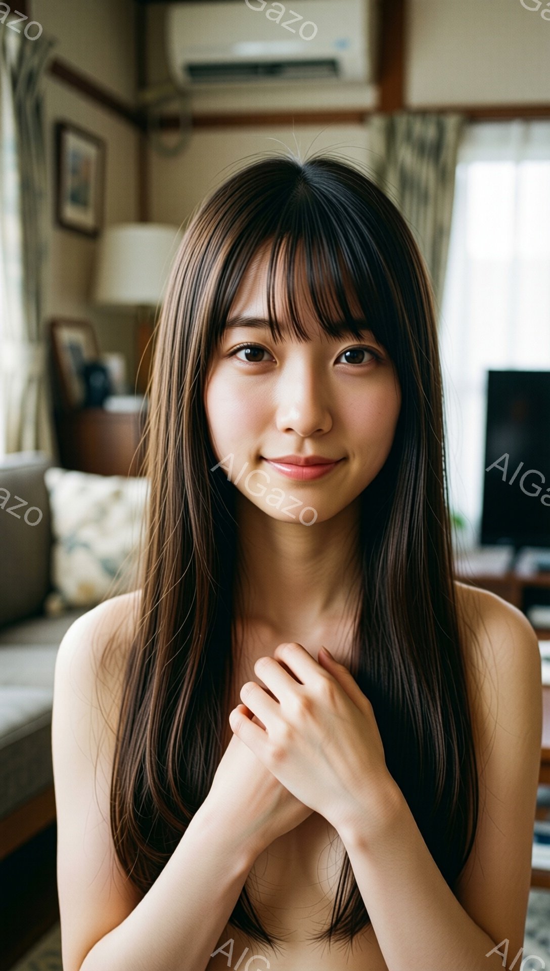 長い黒髪の女性が、胸の前で両手を重ねて微笑んでいます。彼女は上半身裸で、柔らかい光が肌を照らし、穏やかな雰囲気を醸し出しています。背景には、観葉植物や家具が見え、リビングルームのような室内がうかがえます。
