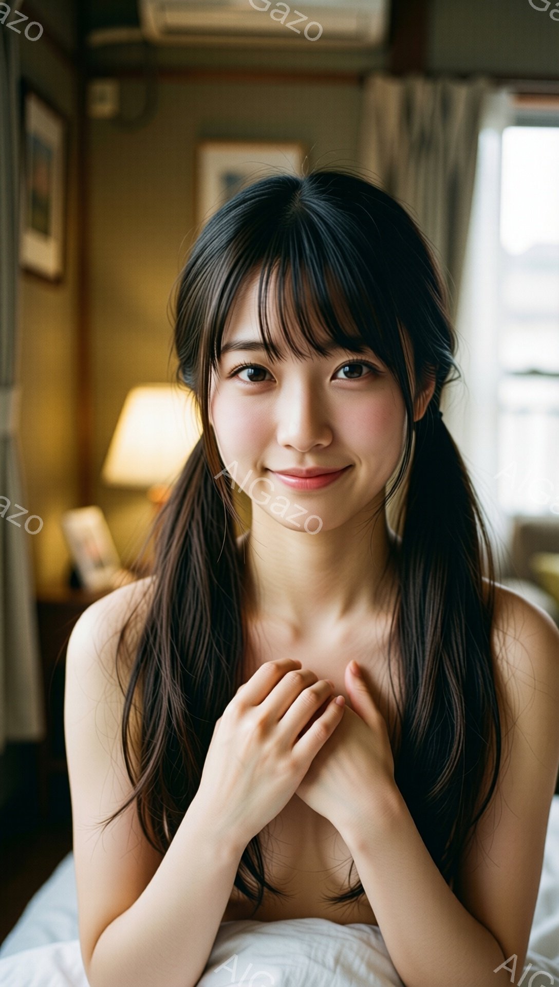 「長い黒髪をサイドで結び、頬をほんのり赤らめた若い女性が写っている。彼女は両手を胸の前で合わせており、穏やかで優しい微笑みを浮かべている。背景には畳の部屋、障子、」は、2026年01月06日に作成されたAI生成画像です。 ポートレートをテーマとした高品質なビジュアル素材で、 1088×1920px の解像度で提供しています。 個人利用・商用利用ともに無料でダウンロード可能で、クレジット表記も不要です。