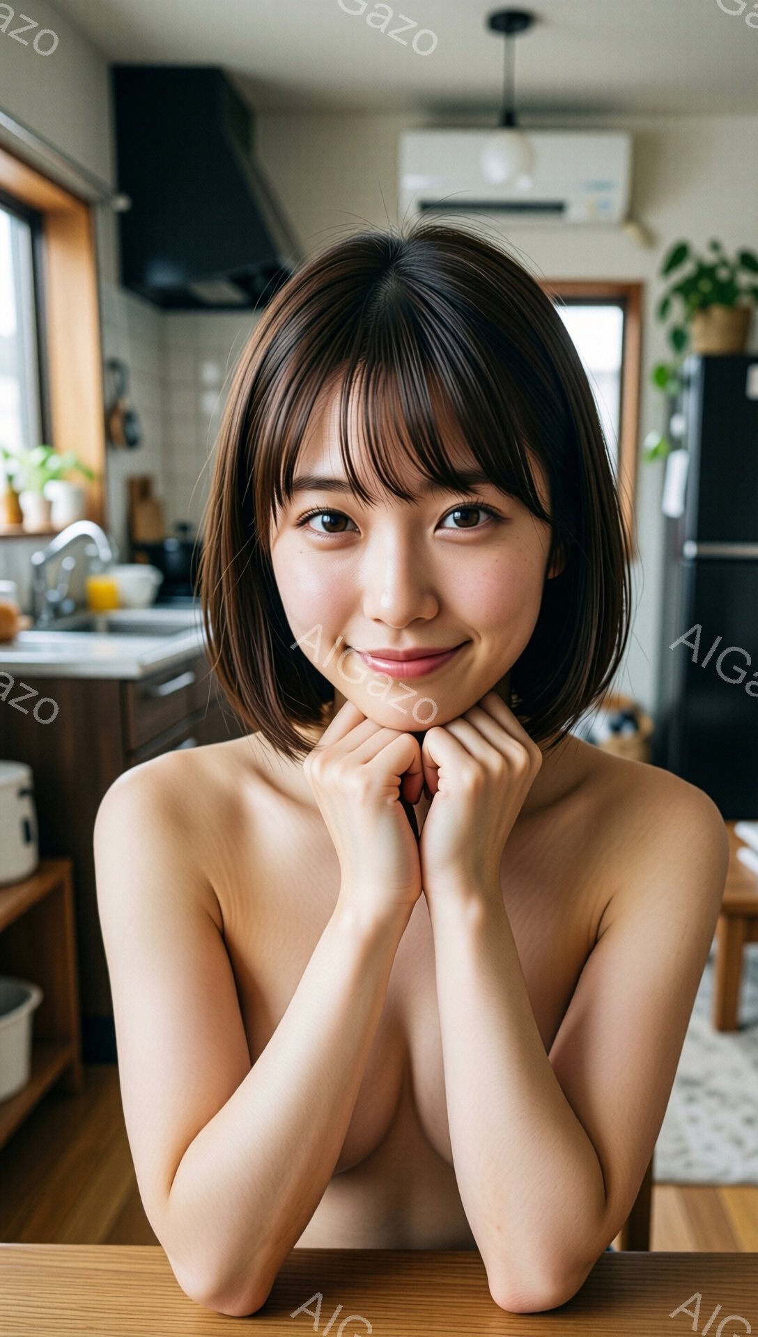 「ショートヘアの女性が、キッチンを背景に微笑んでいます。彼女は肩出しの服装で、両手を胸の前で組んでいます。背景にはキッチン設備が見え、暖色系の照明が温かい雰囲気を」は、2026年01月06日に作成されたAI生成画像です。 キッチンをテーマとした高品質なビジュアル素材で、 1088×1920px の解像度で提供しています。 個人利用・商用利用ともに無料でダウンロード可能で、クレジット表記も不要です。