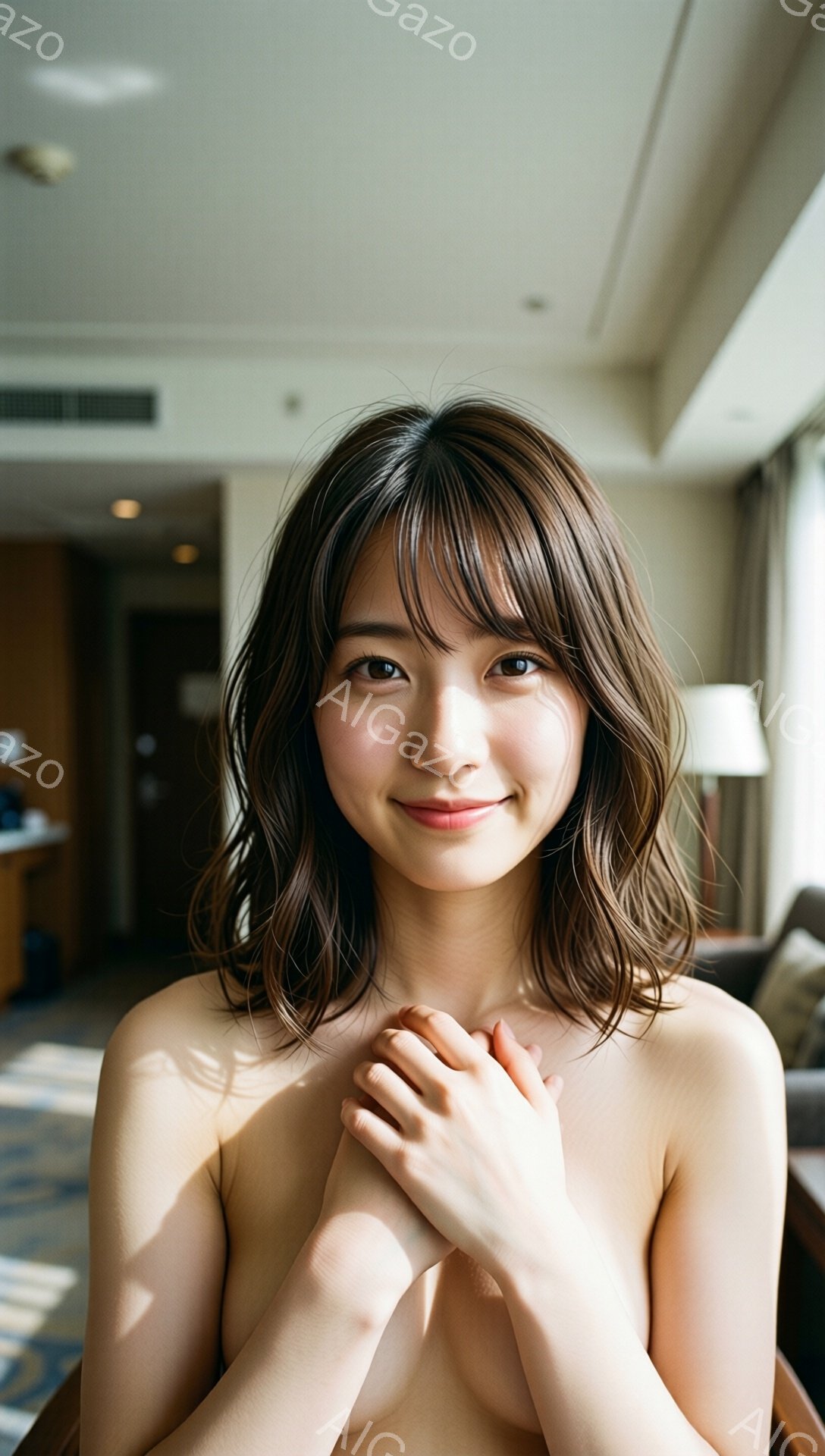 「明るい室内で、茶髪の女性が正面を見つめて微笑んでいます。彼女は上半身裸で、両手を胸の前で組み、柔らかい表情を浮かべています。背景にはソファやテーブルが見え、自然」は、2026年01月06日に作成されたAI生成画像です。 ソファをテーマとした高品質なビジュアル素材で、 1088×1920px の解像度で提供しています。 個人利用・商用利用ともに無料でダウンロード可能で、クレジット表記も不要です。