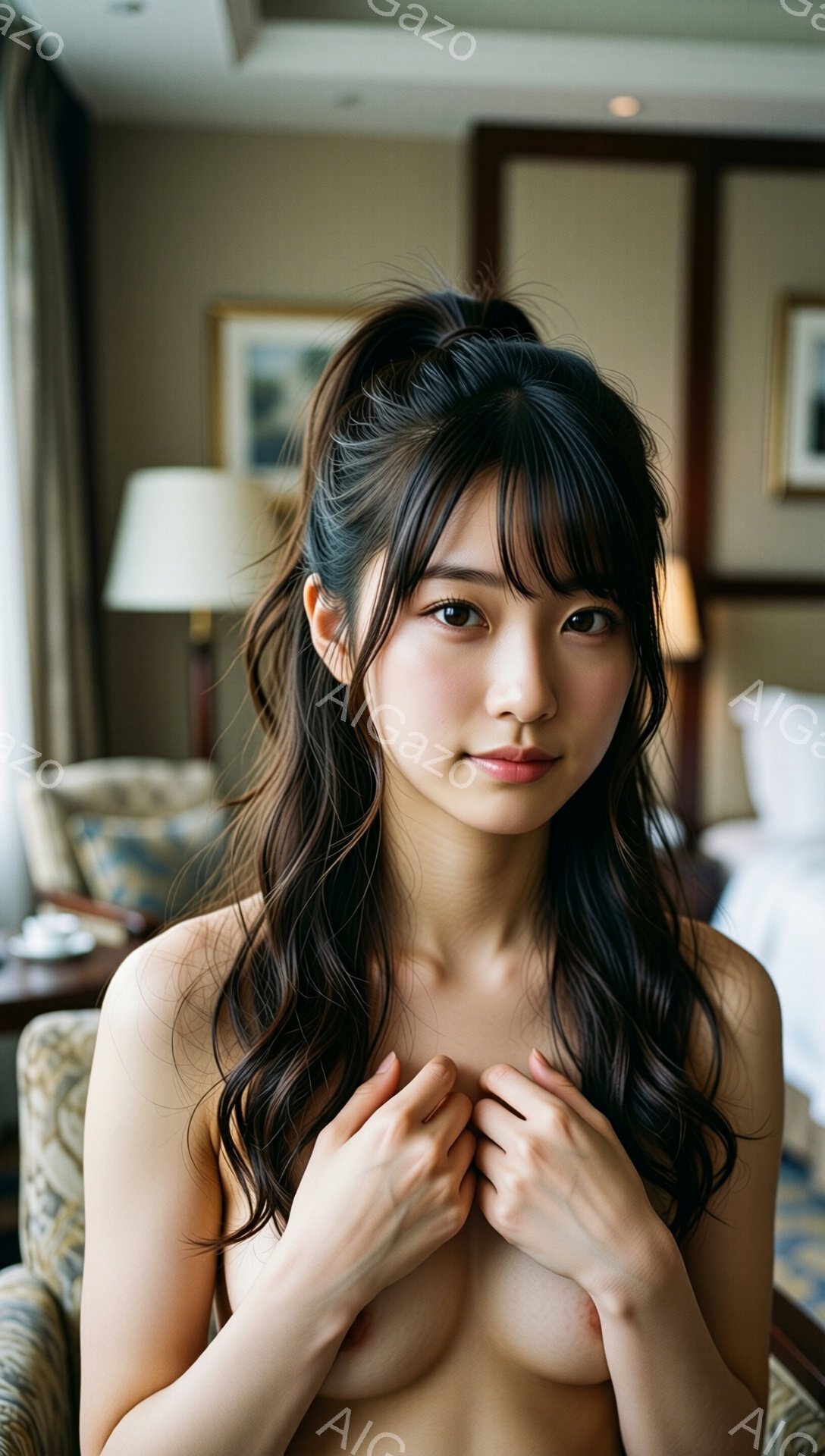 長い黒髪をサイドで編み込み、前髪を少し垂らした女性が描かれています。彼女は上半身に何も着ていませんが、両手を胸の前で重ねています。背景には、ベージュと茶色の落ち着いた色調の高級感のあるリビングルームが見え、暖色系の照明が暖かく照らしています。