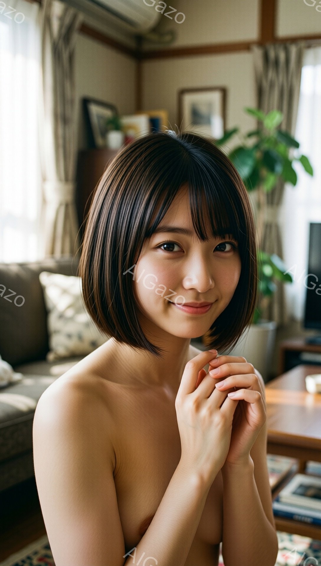 画像には、短い黒髪の女性が写っており、頬を軽く赤らめながら微笑んでいます。彼女は上半身裸で、両手を重ねて胸の前で抱えています。背景には、自然光が差し込む室内、ぼやけたソファやテーブル、そして窓の外の緑が見えます。