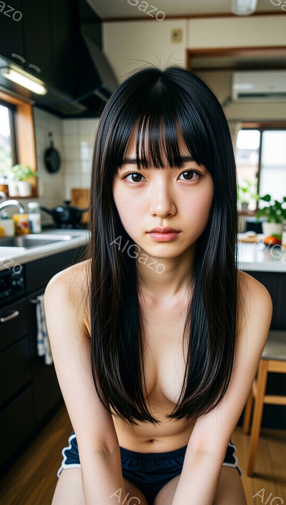 長い黒髪で前髪が目を覆う若い女性が写っている。彼女は上半身裸で、短い黒いショーツを着用し、椅子に座ってカメラを見つめている。背景にはキッチンがあり、調理器具や食器が置かれ、窓から自然光が差し込んでいる。
