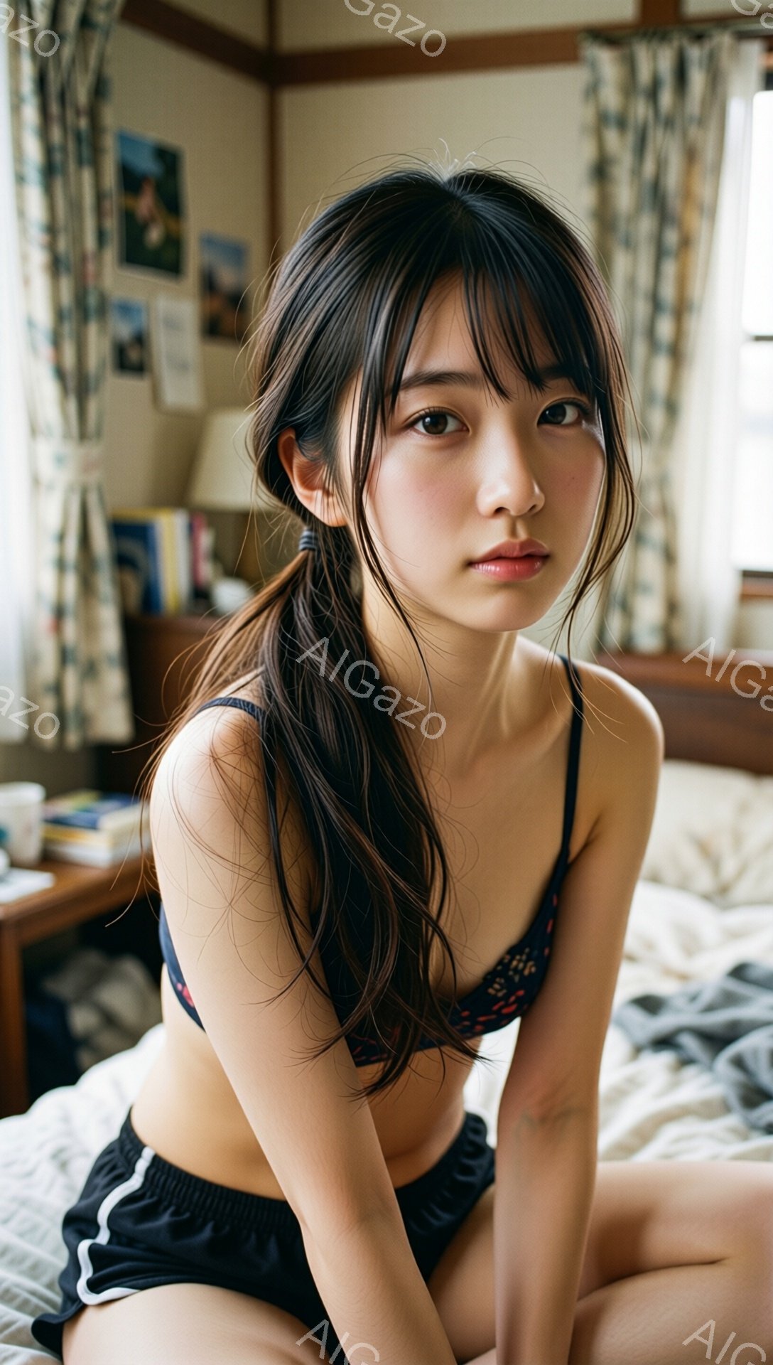 長い黒髪をハーフアップにした若い女性が、白いタンクトップと紺色のショートパンツ姿でベッドに座っています。彼女はカメラに向かって少し憂いを帯びた表情で、リラックスした姿勢で膝を抱えています。背景には室内の一部が見え、壁に掛けられた絵や家具、そして少し散らかった様子がうかがえます。