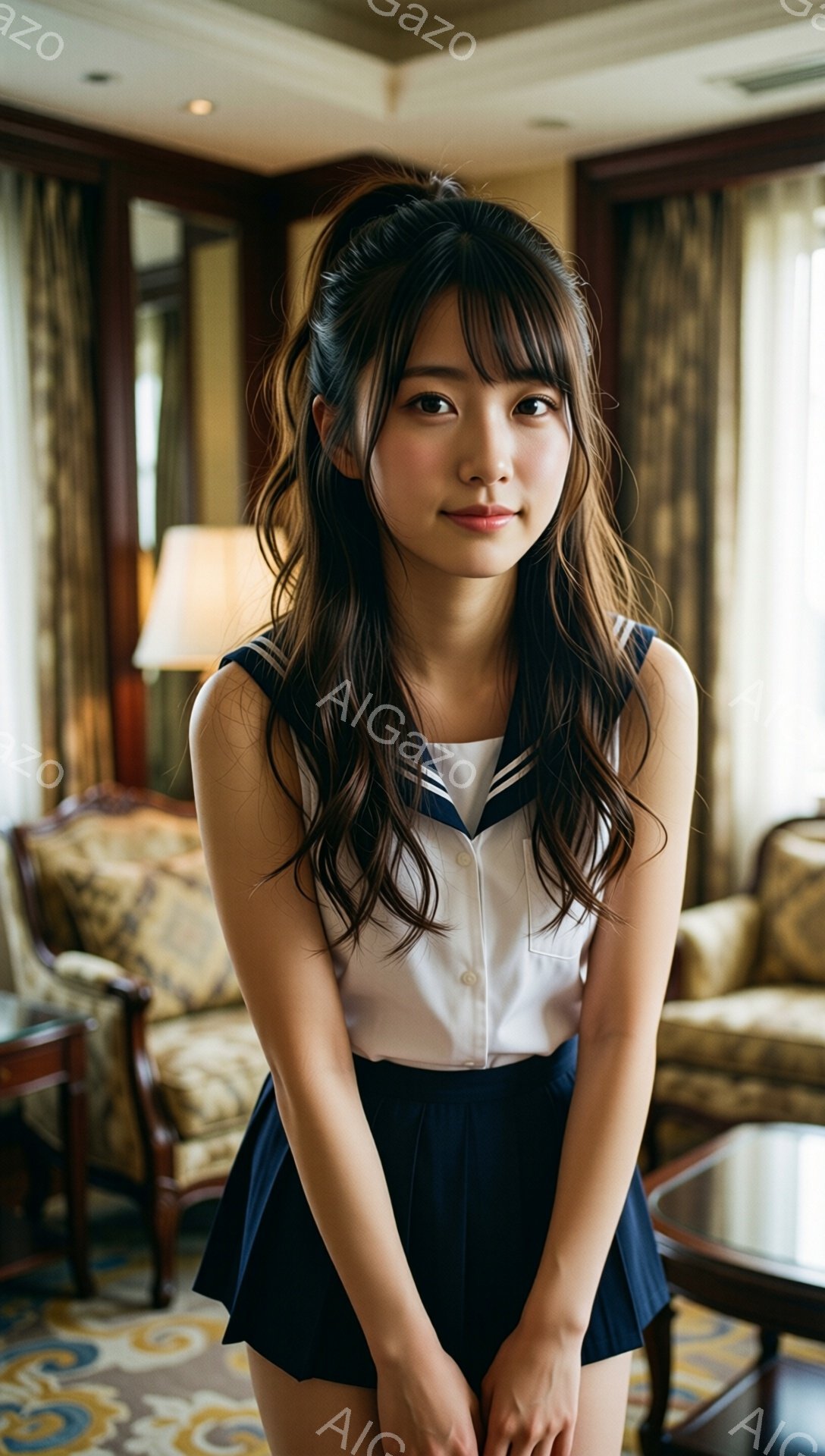 「長い茶色の髪をハーフアップにし、笑顔を見せている若い女性が写っています。彼女は紺色のクロップド丈のトップスとショーツを身に着けており、少し腰に手を当てて立ってい」は、2026年01月06日に作成されたAI生成画像です。 カジュアルをテーマとした高品質なビジュアル素材で、 1088×1920px の解像度で提供しています。 個人利用・商用利用ともに無料でダウンロード可能で、クレジット表記も不要です。