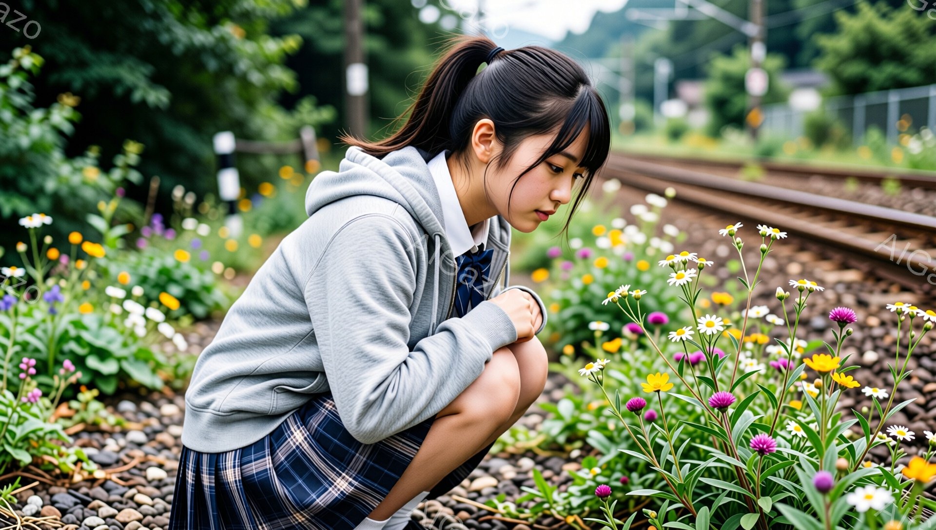 茶髪の少女が、線路脇の花壇に咲く花を見下ろしながら蹲っている。彼女はグレーのパーカーとスカートの制服を着ており、髪は後ろでポニーテールに結ばれている。背景には緑豊かな植生と、遠くに見える電車が写っており、少し曇り空の下、静かで穏やかな雰囲気が漂っている。