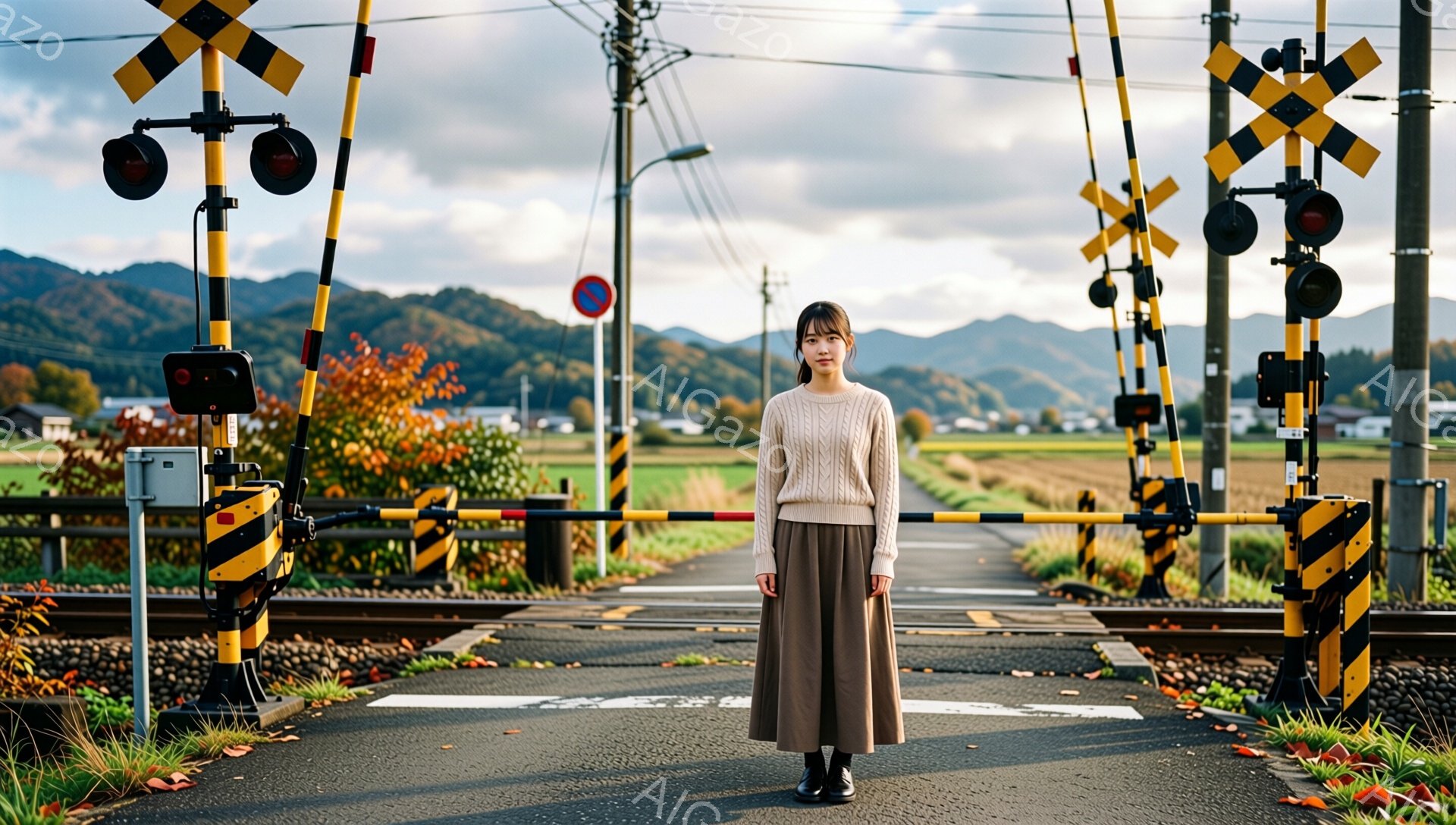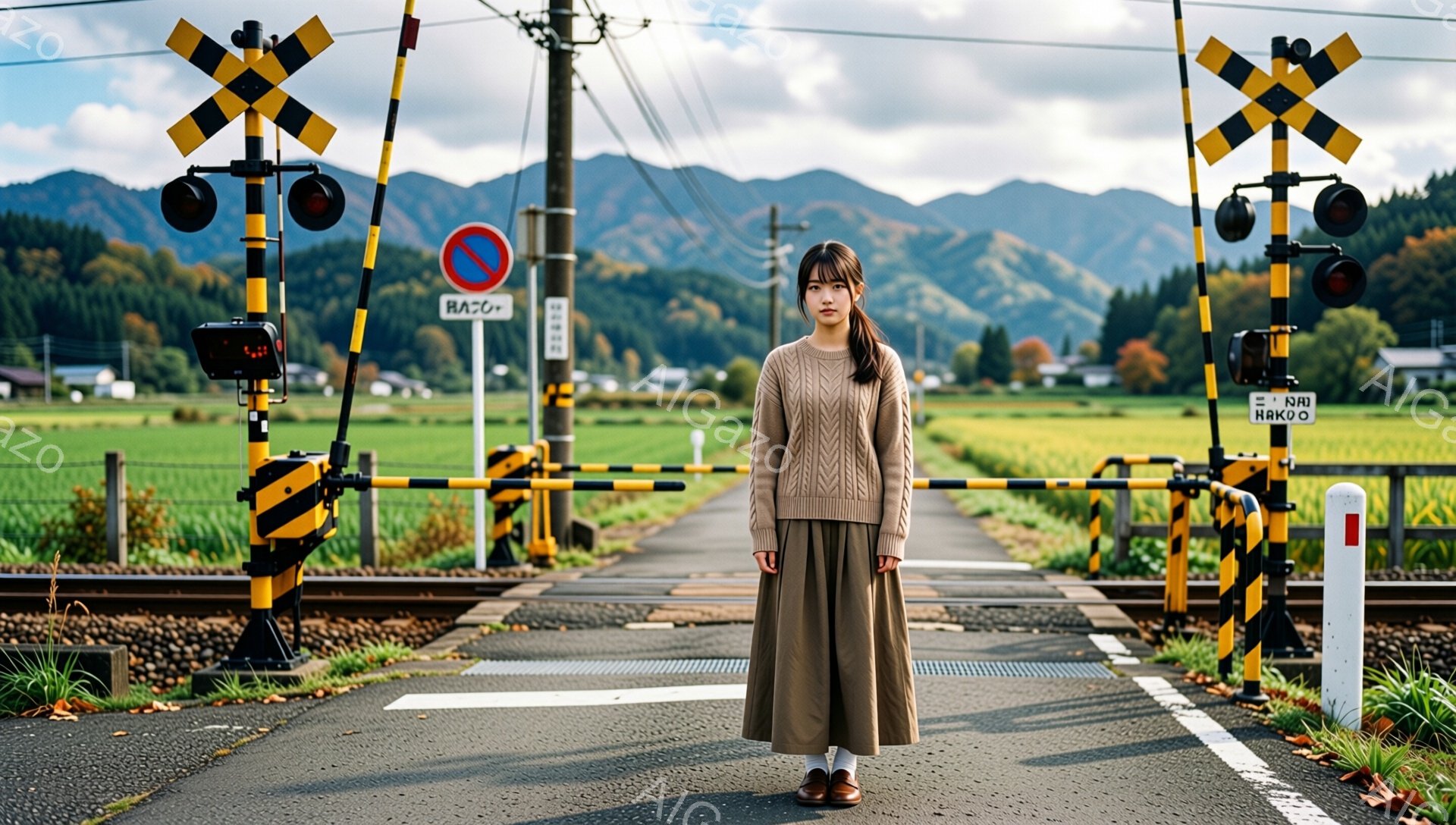 長い茶色の髪を下ろし、ベージュのセーターとオリーブグリーンのロングスカートを着用した若い女性が、線路の真ん中に立っている。彼女は少し物憂げな表情で、前を見つめている。背景には踏切、信号、そして緑豊かな丘陵地帯が広がり、曇り空の下で落ち着いた雰囲気を醸し出している。