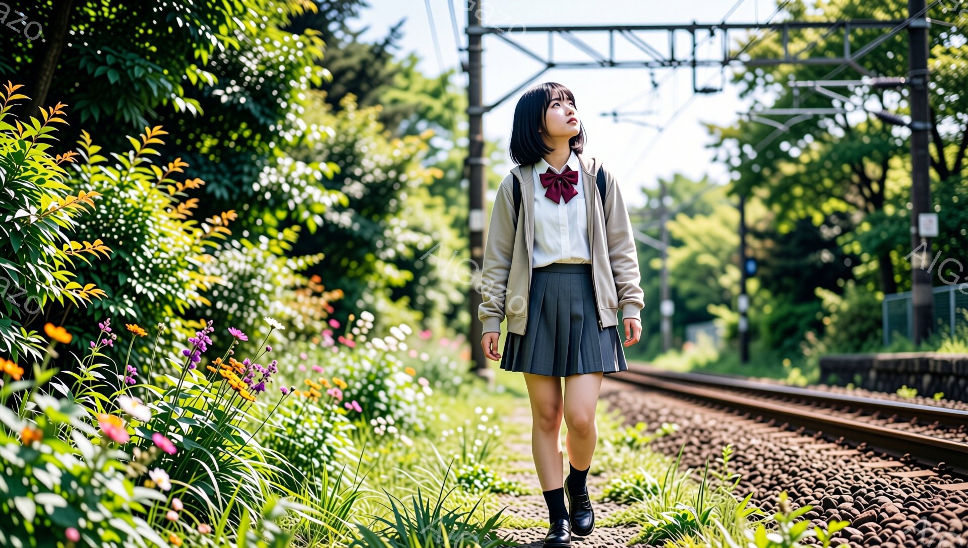 画像には、制服を着た若い女性が写っています。彼女はクリーム色のカーディガン、濃い青色のプリーツスカート、白いソックス、黒い靴を履き、首には赤いリボンを結んだネクタイをしています。彼女は線路沿いの緑豊かな草地に立ち、わずかに横を向き、遠くを見つめており、少し憂いのある表情をしています。